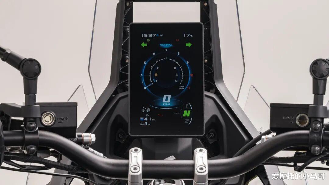 车内搭载7寸全彩TFT液晶仪表,显示清晰、信息全面,支持手机互联、导航投屏,强光下也能清晰可视,而且因为是竖屏的,位置又很高,所以即使是站姿骑行时,也不用低头看仪表。