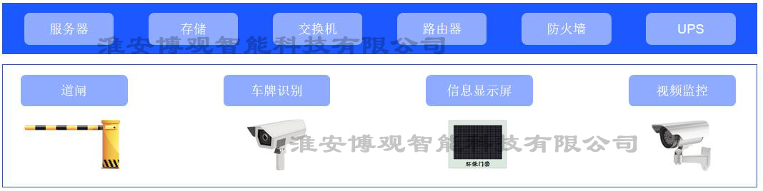 系统建设的前端硬件包括:道闸、车牌识别摄像机、全景摄像机、信息显示大屏、声光报警器等;