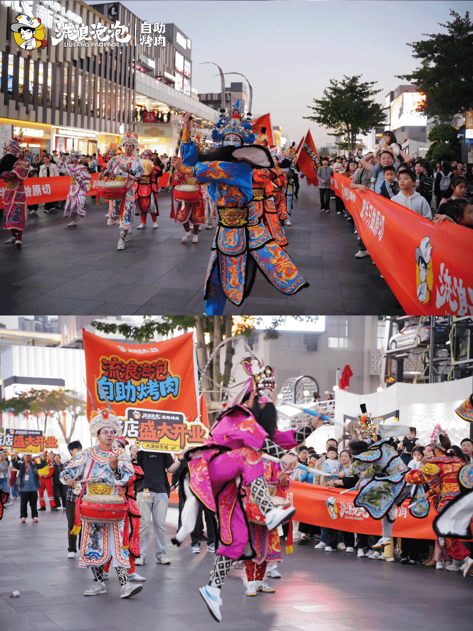 在这股浪潮中,自助烤肉赛道也开始了自己的尝试。11 月 28 日,流浪泡泡在深圳福田、南山、龙华三个区域同步启动主题活动,将广东特色的英歌舞表演直接搬进了开业现场。相比将非遗停留在包装设计层面,这种将非遗表演作为活动核心内容的做法显得更为大胆 —— 既顺应了非遗消费热潮,也为品牌制造了足够的话题性。