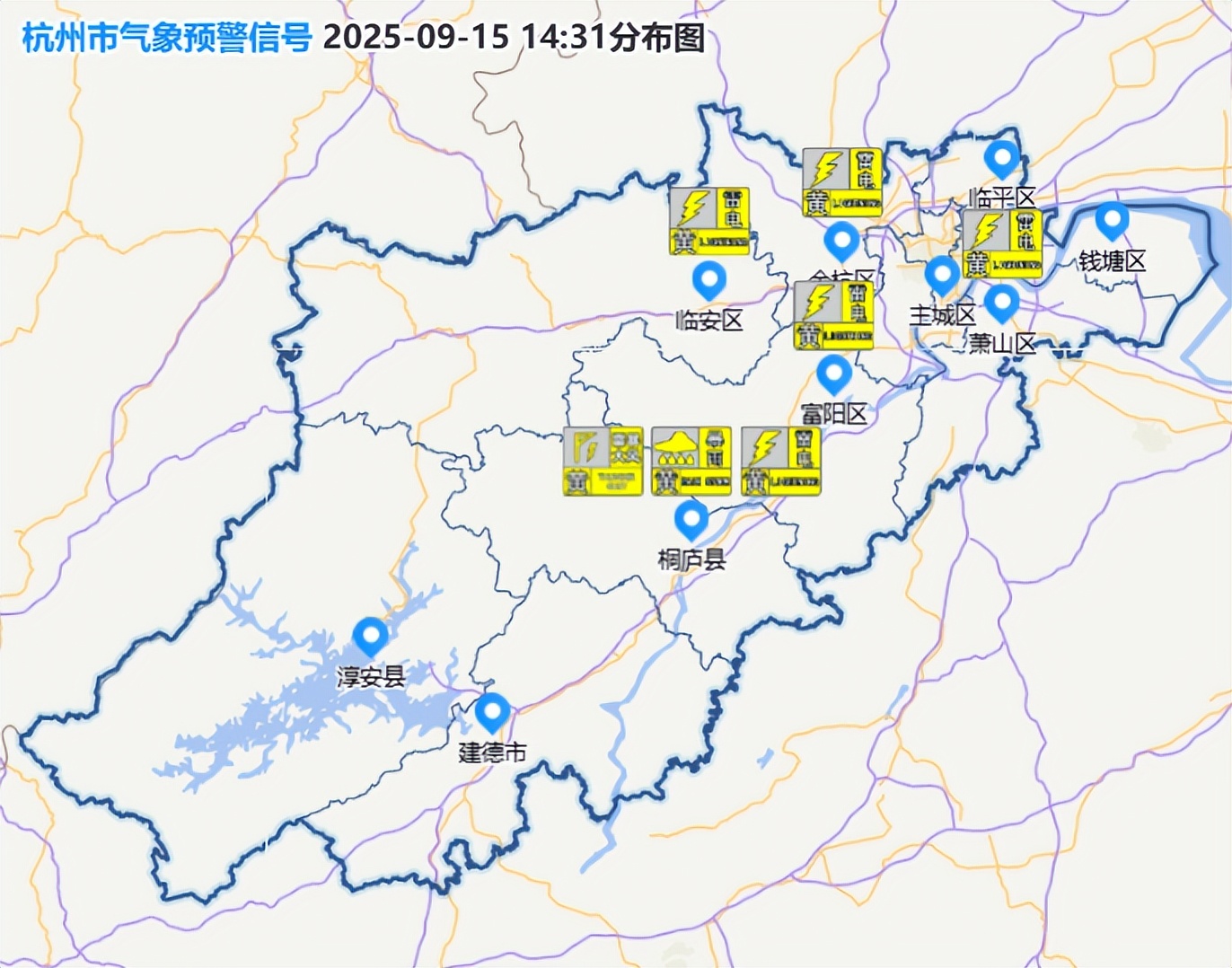 午后桐庐、富阳、萧山、余杭、萧山等地陆续发布黄色雷电预警等,大家注意防范雷阵雨突袭。
