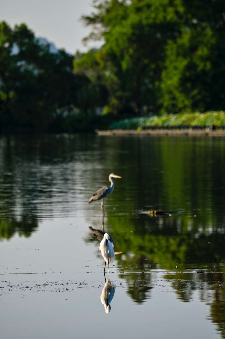 @吧逗:晨,岳湖,白鹭灰鹭翩跹,湖面倒影如画。