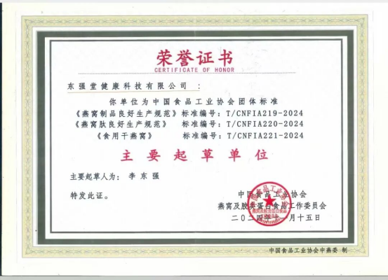 在本次大会上,三项关键团体标准——《燕窝制品良好生产规范》《燕窝肽良好生产规范》及《食用干燕窝》正式发布。这些标准为燕窝产业的高质量发展提供了明确的技术指引和品质保障,不仅推动行业迈向规范化、科学化,也为消费者选择优质、安全的燕窝产品奠定了坚实基础。东强堂作为标准制定的参与者和推动者,始终坚持以高标准引领企业发展,持续完善自身产品体系与质量管理机制。