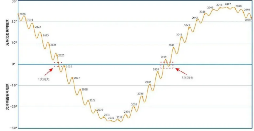 从年初4.3°开始摆动缩小,并在3月24日以及11月24日两次达到0°,也就是说这两天土星环完全侧向地球方向,变成一条线。