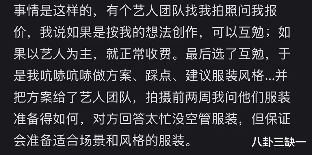 但关键在于,摄影师也说了,早在艺人团队主动联系她询问报价时,她就明确告知了两种合作模式:若按摄影师的创意想法创作,可选择互勉;若以艺人的需求为主导,则按商业标准收费。是艺人方自己选择了“互勉”模式,并达成了“以摄影师为主创”的合作共识。
