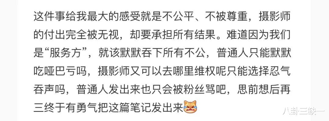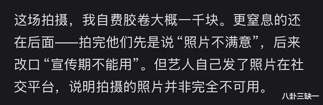 拍摄后艺人团队先以“照片不满意”为由推脱,后改口“宣传期不能用”禁止摄影师发片,结果艺人方却把成片发在了社交平台......