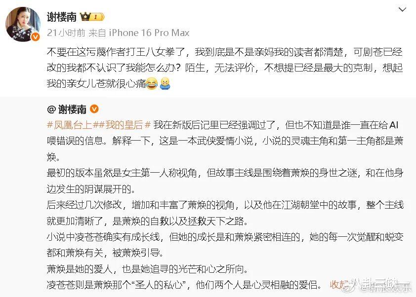 添油加醋“她很会玩转舆论”的,拿她和《凤凰台上》原著作者谢楼南的争执当作依据。