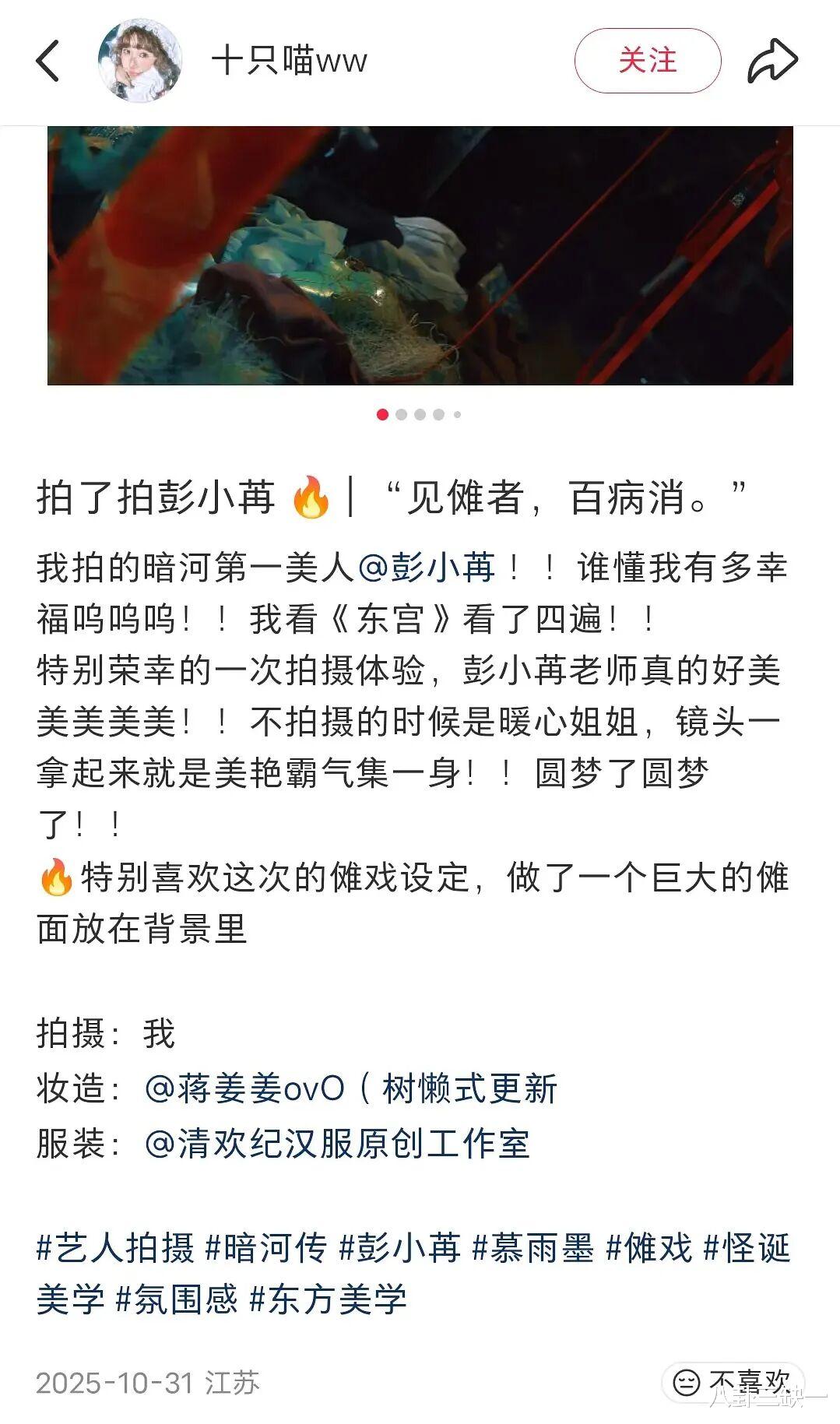 啥声音都有,彭小苒一下就被推到了风口上。也不是没有网友质疑摄影师在编造艺人耍大牌的桥段为自己引流啊,但点进她主页看,不仅有和任敏、李梦等不少女明星的合作作品,而且照片质感高级细腻,光影运用精准老道,一看就是深耕行业多年的专业人士。