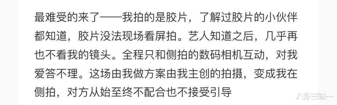 摄影师告知艺人胶片拍摄无法现场看屏后,艺人几乎再也不看摄影师的镜头,全程只与侧拍的数码相机互动,对摄影师的引导全程不配合、不接受;