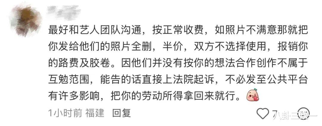 一边还化身“军师”,替这位委屈的摄影师出谋划策,要么和艺人团队明确沟通,直接按正常商业合作收费;要是对方对成片不满意,那就把发过去的照片全删,顶多收取半价辛苦费,或者干脆约定双方都不使用。最起码也得把踩点路费、胶卷成本给报销了,总不能让摄影师又出钱又出力还受气吧?