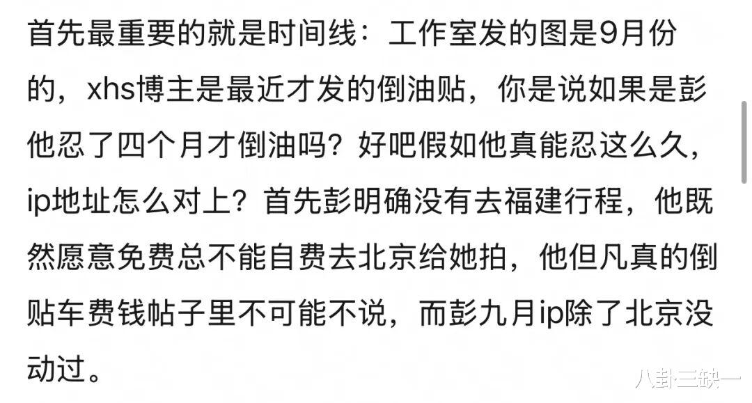 什么工作室发的那组图明明是去年9月的,摄影师却是最近才爆料呀,总不可能忍了四个月才出来发声吧?退一步讲,就算她真能憋这么久,ip地址也对不上,彭小苒那段时间根本没有去福建的行程,公开的ip轨迹除了北京再无其他记录。