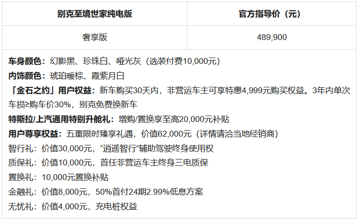 2026年3月17日 今天,别克品牌宣布:旗下首款纯电MPV——至境世家纯电版上市,推出纯电奢享版一款车型,官方指导价48.99万元。至境世家纯电版延续“别墅级新能源旗舰MPV“定位,完整继承插混版车型的硬核实力,更以900V 6C超快充电池、“哑光灰”双拼色高定涂装、“金石之约”用户权益、特斯拉车主专属增换购礼遇等多项行业首发科技与权益,实现纯电出行体验的全面跃升。