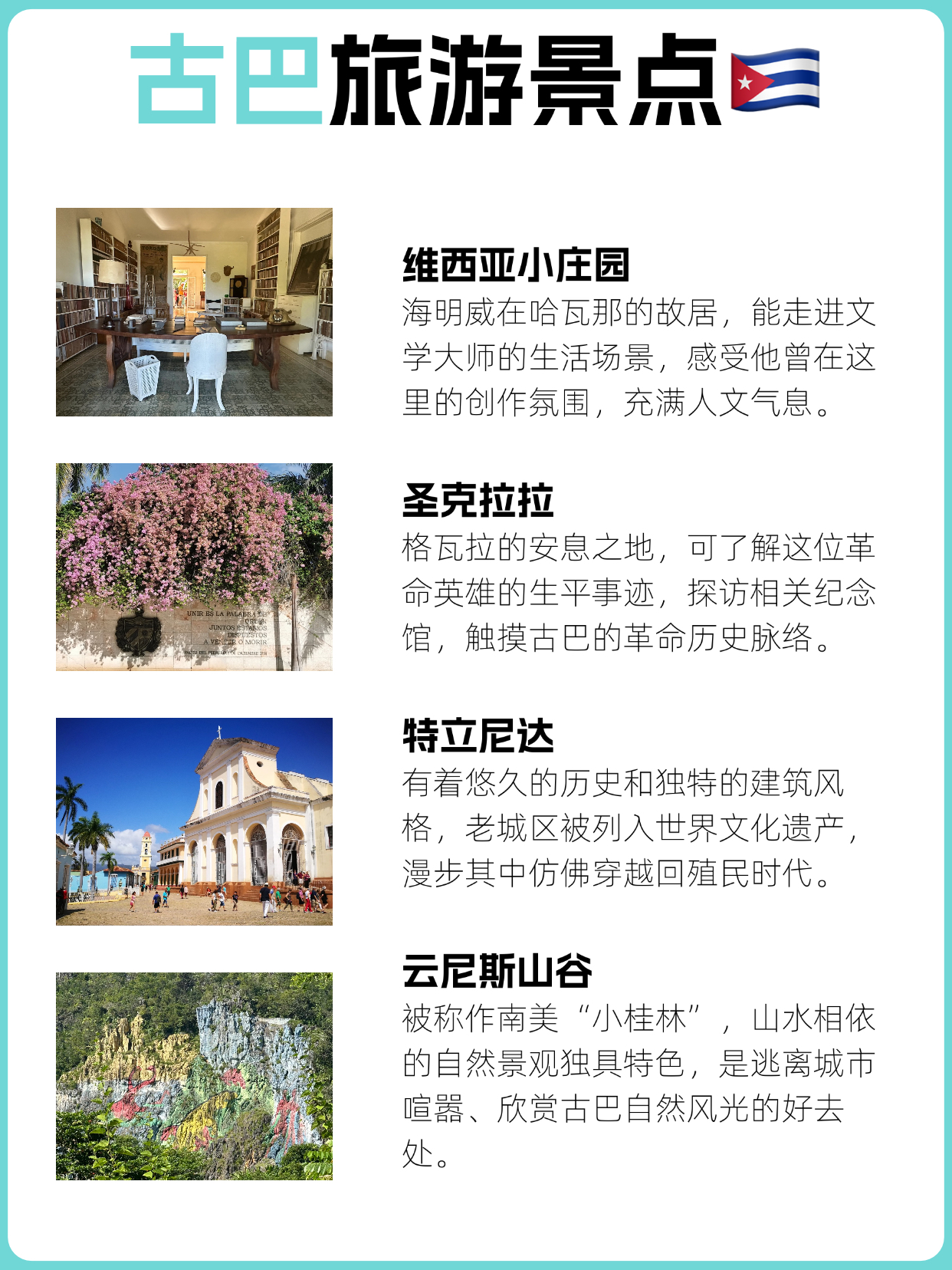 ✅走进海明威的维西亚小庄园,感受文学大师的创作氛围,还有圣克拉拉的格瓦拉纪念馆,触摸古巴的革命历史脉络;