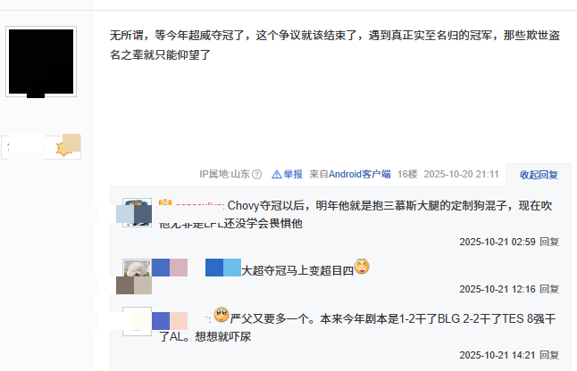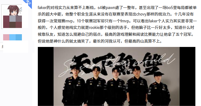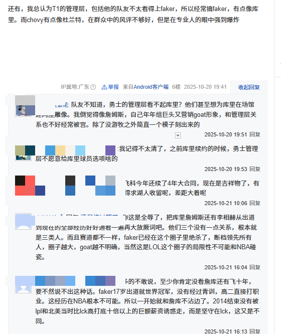 也有网友说话中立, 承认Faker是“最长的河”, 打了这么多年, 状态一直没怎么掉, 这本身就是个传奇, 大家心里也清楚, 联赛冠军不可能让一个非顶尖中单拿到, 进决赛都费劲, 这么说, 他顶尖是跑不了的, 是不是神级就得另说, 还有些人说得更直接, Faker就是运气好, 荣誉是队友和环境抬起来的, 冠军有点像给他定制的, 真要比谁更高, 不是比谁拿得多, 而是谁才是那个GOAT。
