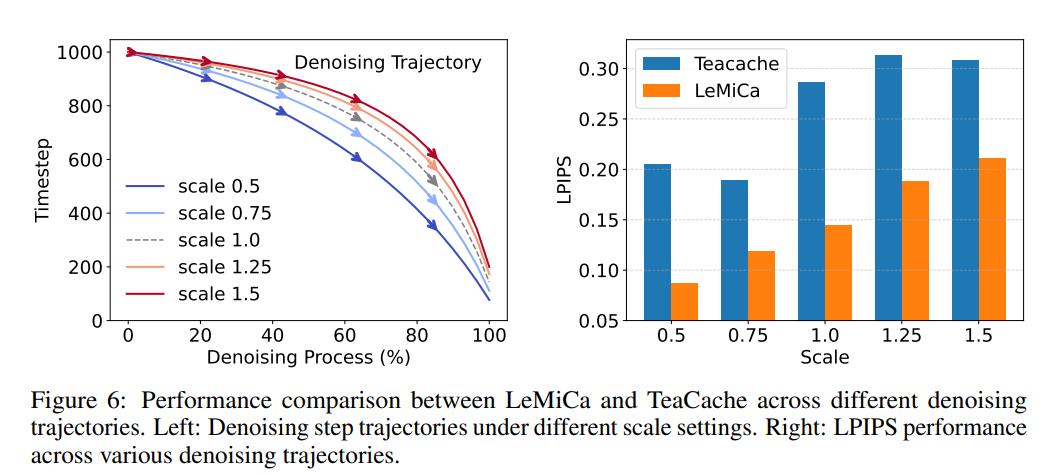 加速路径的鲁棒性:即使改变采样调度中的轨迹缩放参数得到不同的去噪轨迹,LeMiCa仍有较好的效果,体现了良好的路径鲁棒性。