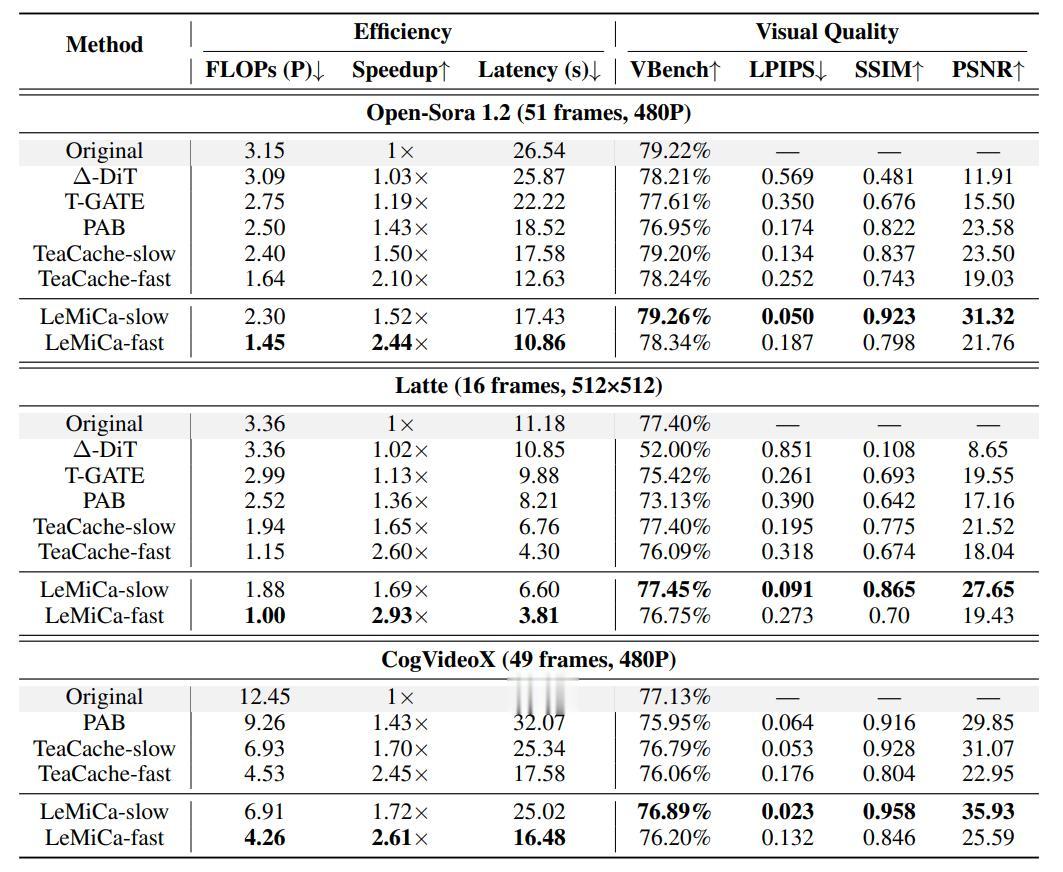 从结果中可以看出,LeMiCa对比其他主流方法,存在以下明显优势: