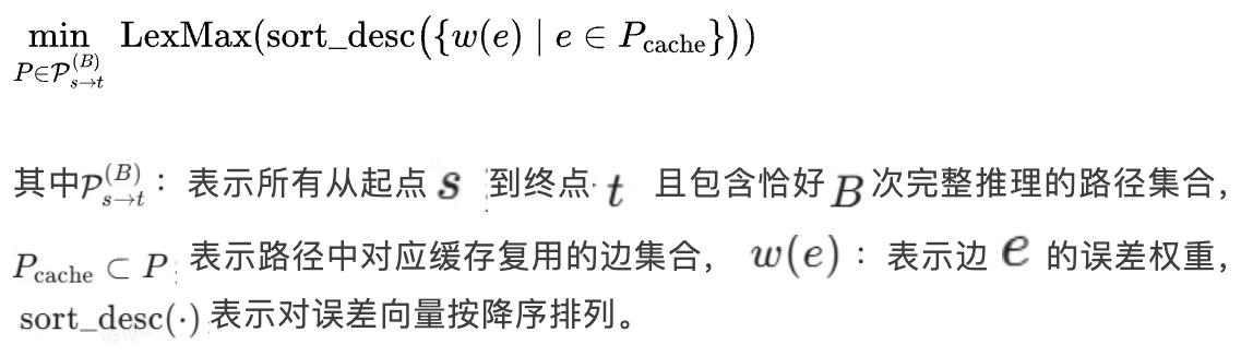 字典序极小化路径优化(Lexicographic Minimax Path):在构建好静态误差图之后,LeMiCa 将缓存调度问题形式化为:在固定预算 B 下,从起点到终点寻找一条最优路径。由于传统的“最短路径”或“局部最优”算法不具备线性可加性,导致最短路径算法不再适用,LeMiCa采用了字典序极小化准则来进行路径搜索。这种优化方式不追求误差总和最小,而是逐层比较路径中各段缓存的误差值,确保: