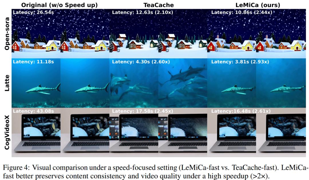 从视觉效果上看,LeMiCa生成的视频在结构风格保持、内容一致性方面都显著提升。