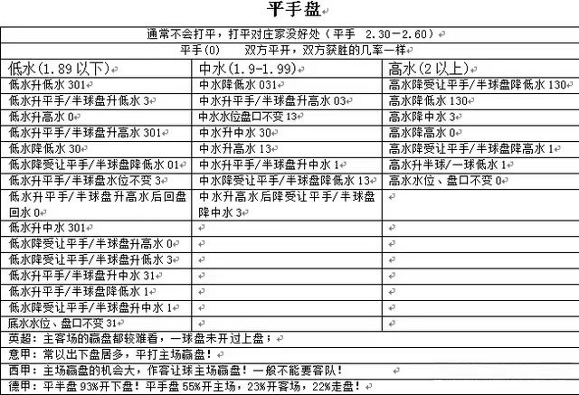 1、平手盘下一直保持不变,只是水位有升跌 (1)开盘时,上盘低水,则上盘胜出机会大。 (2)开盘时,上盘水位较高,则下盘胜出或走水机率大。 (3)开盘时,上盘水位较高但水位下跌,相对来说平局居多。 (4)开盘时上下盘水位持平,则后盘低水方不败。 (5)如盘口、水位一直保持不败,则低水一方胜出机率大。 2、平手盘主队出现升盘(平手升平半) (1) 开盘时主队低水,后升为主让平半,应下客队。 (2) 开盘时主队高水,后升为主让平半,应下客队(多为平局)。 3、平手盘客队出现升盘(平手升平半) (1)客队初盘平手低水改让平半高水,则**看好客队跑出,甚至有机会赢球回家。 (2)客队初盘平手高水改让平半低水,主队不败机会很大。 4、其他平手盘的投注心得: (1) 主队近况状态神勇,但碰到实力状态不及自己的对手仅让平手,则让球偏浅,主队不利。 (2) 主队排名高于对手仅让平手,应下客队。 (3) 主队状态不佳但遇到状态很好的对手让出平手盘,主队赢球的可能性很高。 (4) 主队实力排名都不及对手的平手盘下,主队胜面较高。 (5) 主场龙对阵客场龙只让平手,主队不利。 (6) 主场龙对阵客场虫只让平手,多数为平局。 (7) 主场虫对阵客场龙让出平手,主队不败。 (8) 主场虫对阵客场虫让出平手,客队不败。 (9) 强强对碰的情况下开出平手盘,多为战平。 (10) 澳彩平手盘初盘为0.80-0.82水位之间的球队,无论水位盘口怎样变化,赢盘的概率高达80%。 (11) 平手盘下两队水位持平并保持不变,证明双方取胜机会均等,可弃平局。 (12) 意甲平手盘主场赢球机率高。 (13) 德甲平手盘55%开上盘,23%走盘。