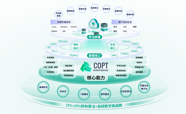 在长期实践中,杉数科技逐步形成了以优化求解器为核心的智能决策技术体系。其核心产品优化求解器COPT,是面向大规模、高复杂度优化问题的新一代计算决策引擎。通过将现实世界中的资源、规则和约束条件转化为可计算的数学模型,并借助高性能算法进行快速求解,COPT能够为各类复杂系统提供稳定、可执行的决策支持。
