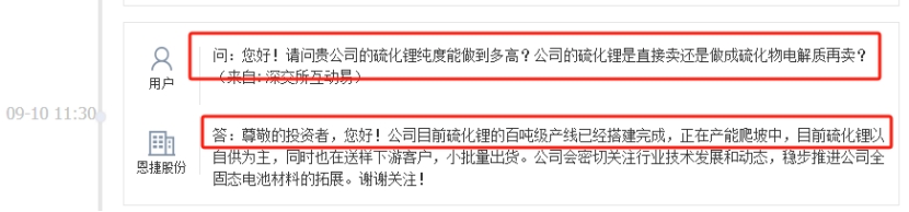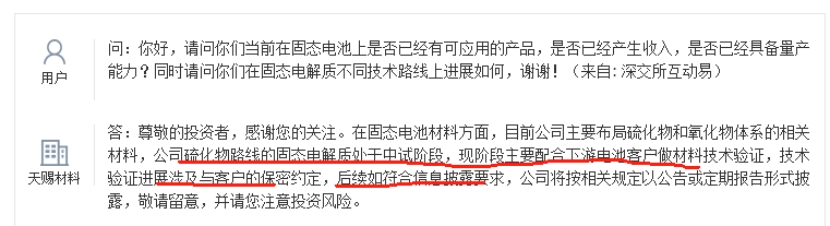 硫化锂核心优势:在投资者关系活动记录表中,该公司称在固态电池材料布局主要包括硫化物及氧化物固态电解质路线,目前硫化物路线的固态电解质处于中试阶段,主要配合下游电池客户做材料技术验证,同时中试产线建设也在持续的推动,公司计划在明年完成中试产线建设,并具备中试量产的能力。与宁德时代、卫蓝新能源联合开发固态电池体系,能量密度达350Wh/kg。