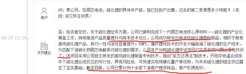 硫化锂核心优势:国内最大锂化合物生产商,硫化锂产能5000吨/年,采用“锂辉石-硫化锂”一体化工艺,成本较外购低20%。已向20余家客户供货,与固态电池企业合作开发高能量密度电池,2025年通过盐湖锂工艺进一步降本。