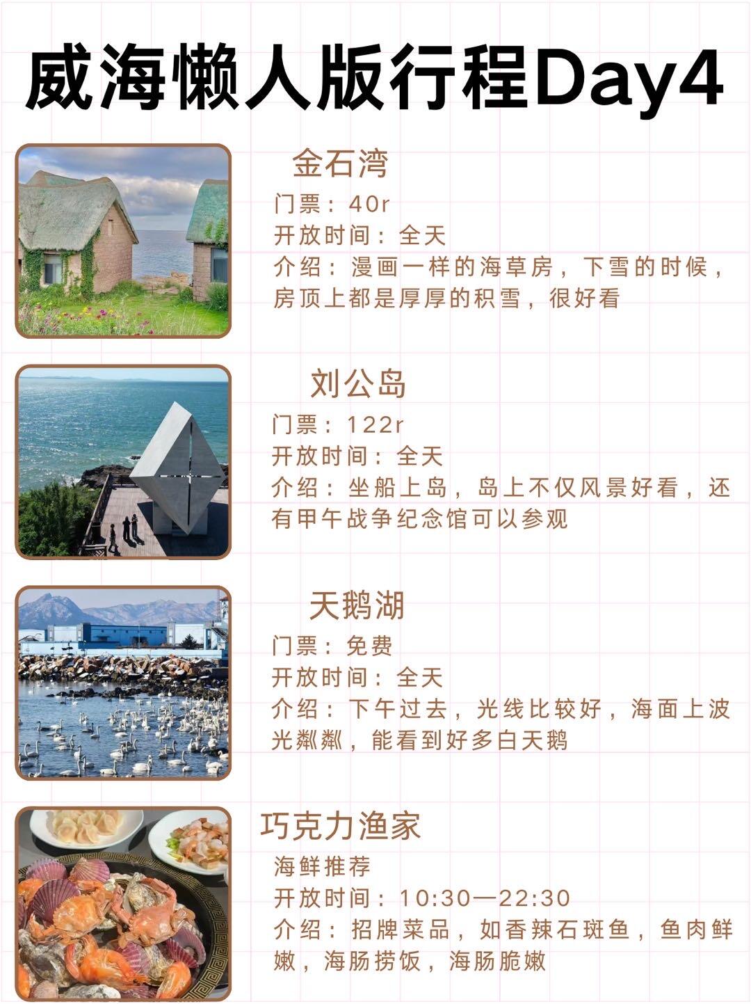 📍Day4: 金石湾(漫画草房很治愈)—刘公岛(参观甲午战争纪念馆)—天鹅湖(成群的天鹅很震撼)—巧克力渔家(不吃后悔系列,一定要尝一尝的海鲜大餐)