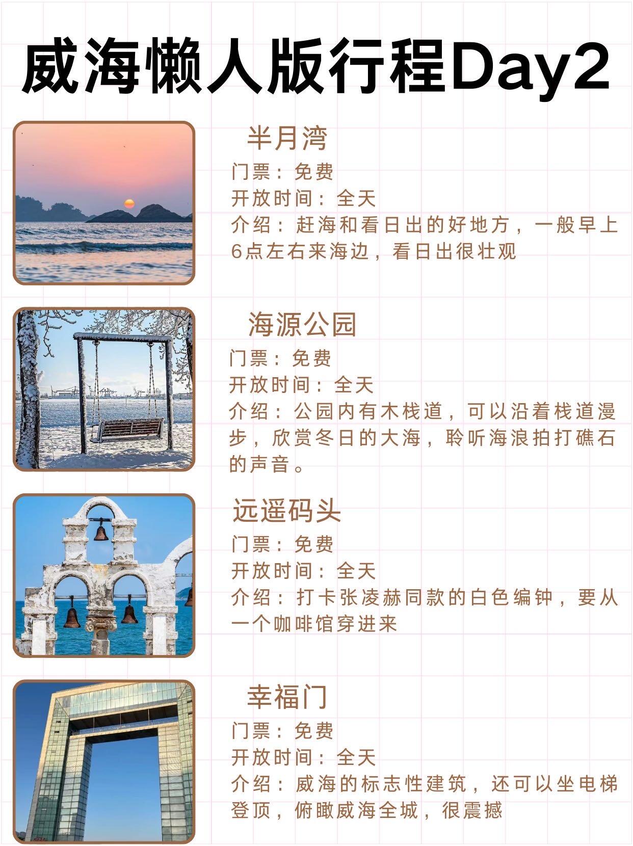📍Day2: 半月湾(来赴一场浪漫的日出🌅)—海源公园(来公园散散步,感受一下静谧的公园)—远遥码头(很震撼,适合拍照打卡)—幸福门(威海地标建筑,要来打卡一下)