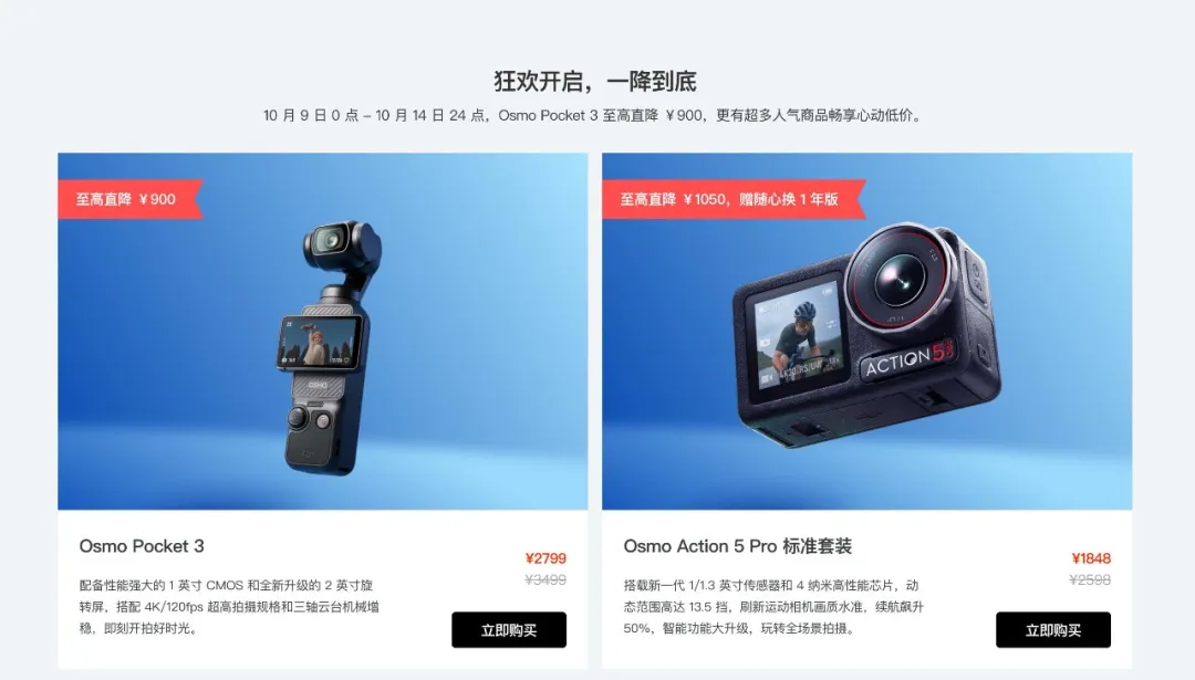 大疆两款新品发售仅一两个月就促销优惠,很难说没有受到与影石竞争影响,也难怪刘靖康在社交平台上对大疆的“贴脸开大”。