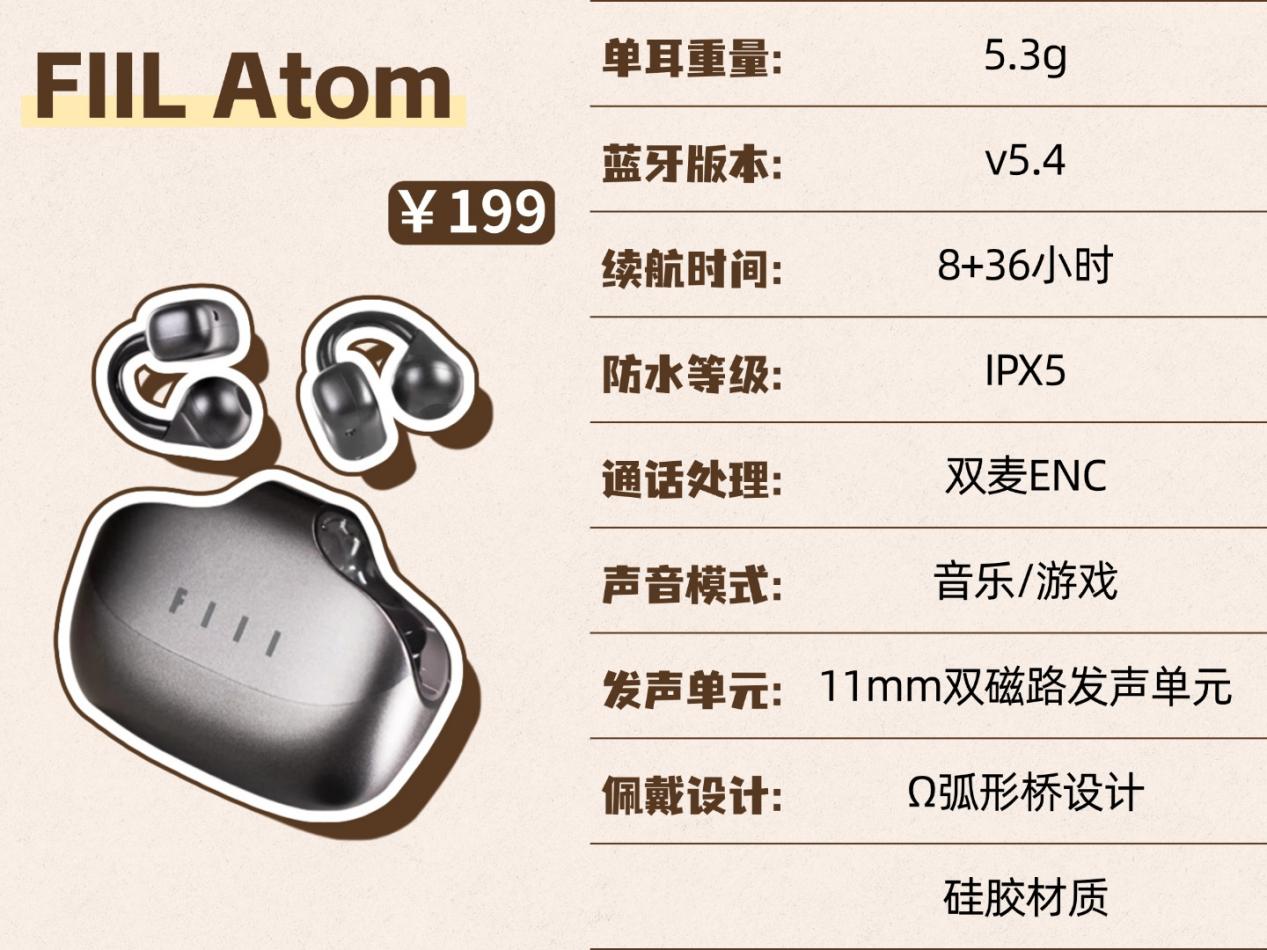 FIIL Atom 这款耳夹耳机,整体表现比较扎实,性价比也不错,日常用来听歌、通话都完全够用。它机身很轻,戴上耳朵几乎没什么负担,存在感很低。不过佩戴时间长了,耳夹位置会有点夹耳,舒适度只能算一般。音质方面没有太多亮点,不算特别出色,但声音清晰通透,不管是听流行歌还是打工作电话,人声和背景音都分得比较清楚,日常使用足够了。它的防水性能比较普通,这一点需要注意。好在续航表现挺好,充满一次电可以用上两三天。整体来看实用性很强,能满足日常基础需求。