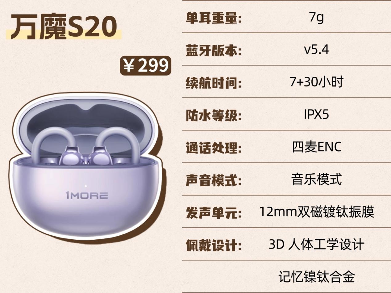 万魔 S20 这款耳机,在音质和通话上表现都比较突出。它搭载了全景空间音效,再加上大师级调音,听歌的时候层次感很强,听感很真实。佩戴上采用人体工学设计,和耳朵贴合得很稳,日常走动、晃动也不容易掉。通话效果也不错,在商场、地铁这类嘈杂环境里,也能清晰听清对方声音。不过它也有两个比较明显的短板:一是机身偏重,戴久了耳朵会有明显的压迫感;二是漏音比较明显,音量稍微开大,旁边的人就能听到,会有点尴尬。