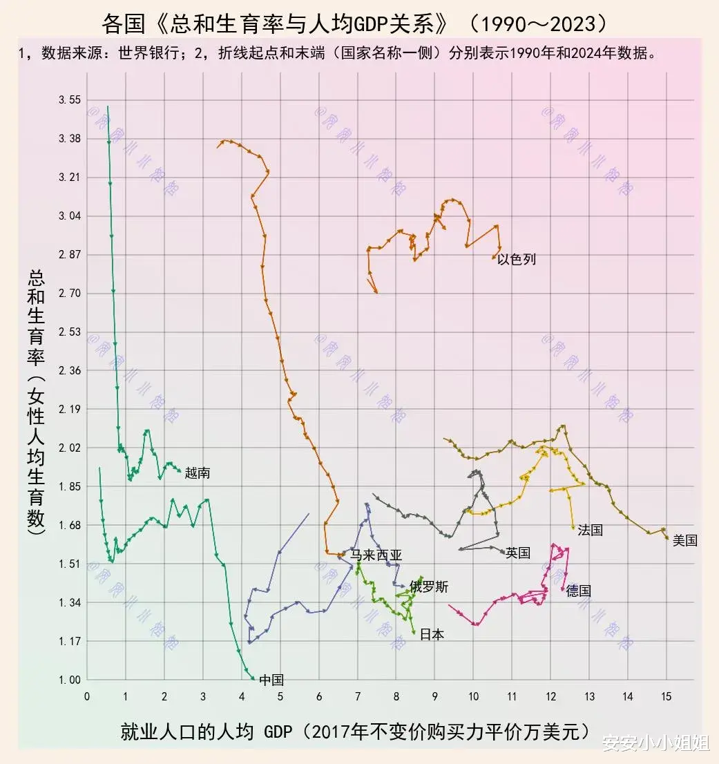观察1990年至2023年间中国、美国和以色列三国总和生育率随人均GDP变化的关系图,我们可以清晰地看到三条截然不同的发展轨迹,它们共同勾勒出一幅关于现代人生育选择的丰富图景。