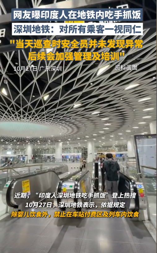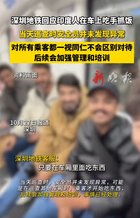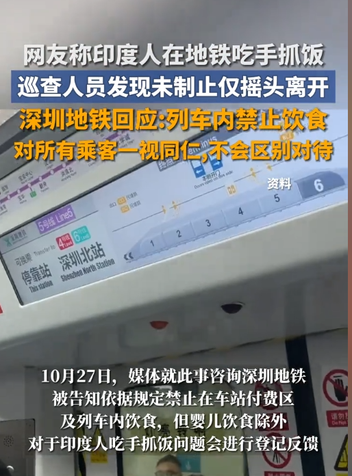 早高峰挤深圳 3 号线的人都懂,车厢里最让人崩溃的不是没座位,是突然飘来的 “意外气味”—— 可能是邻座没盖紧的豆浆味,可能是掉在缝里的瓜子壳味儿,而 10 月 25 号深夜,这趟线里却飘出了满车厢的咖喱香,一群印度乘客围坐着用手抓饭,饭粒掉在座位上,油手往衣角一抹,监控拍得清清楚楚。