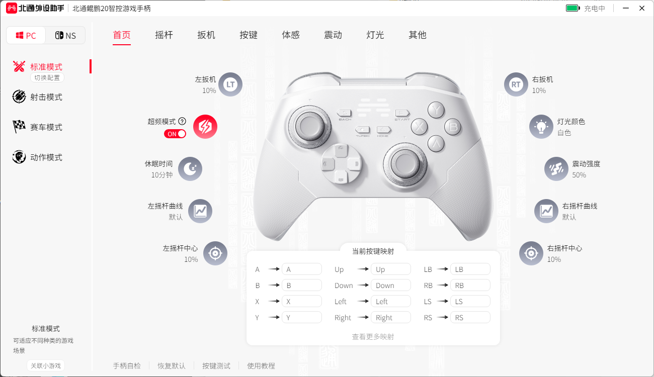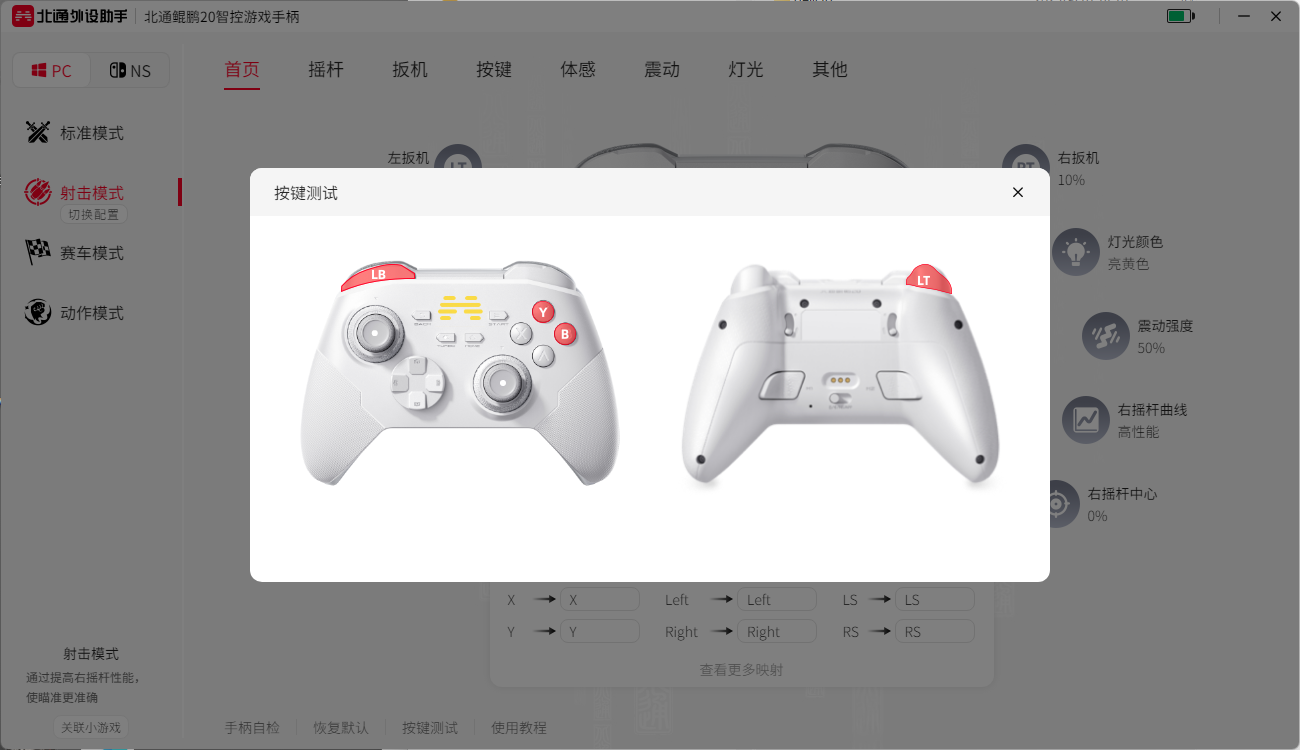 同时在软件的适配上,北通还是一贯地功能丰富,将手柄连接电脑就可以对手柄进行按键设置,除了按键测试等基础操作外,不管是摇杆的灵敏度、手柄震动力度、灯光的显示和手柄背部按键的映射,都可以通过北通游戏大厅来进行可视化配置。包括后续的手柄升级以及宏定义,也可以通过软件来调整,一共有50+项能调整。