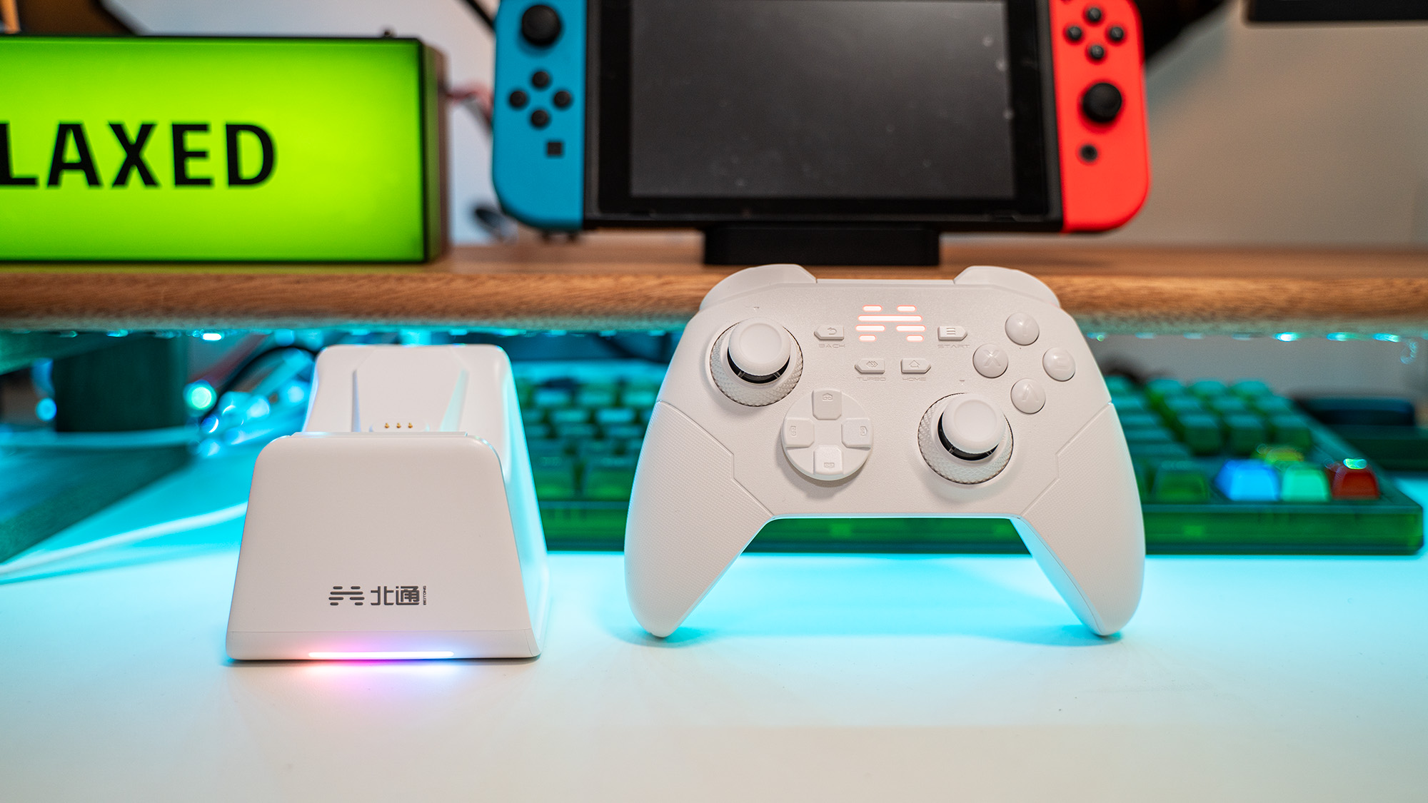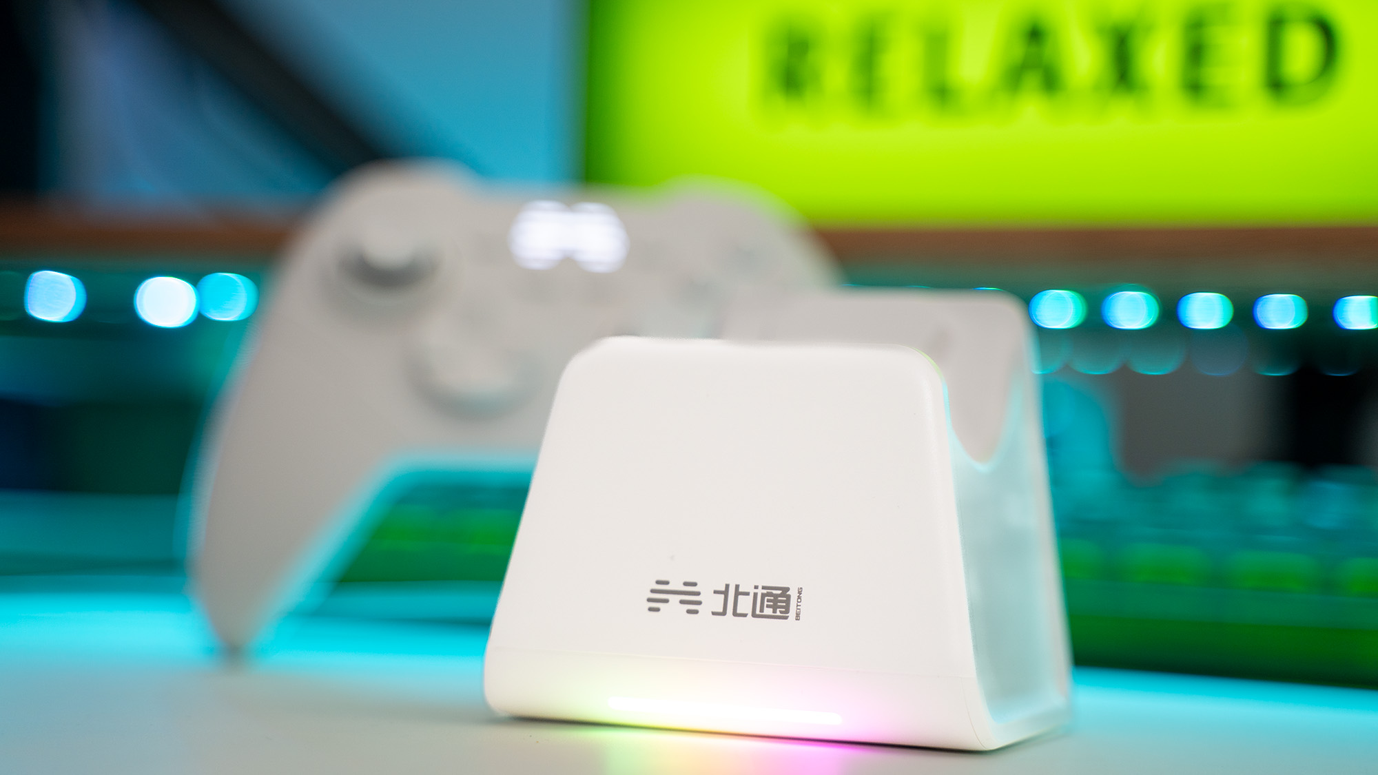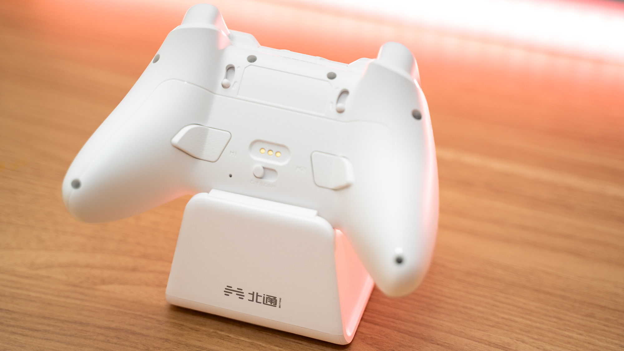 这次鲲鹏20也配备了带RGB灯光的底座,将其放在桌面上很有电竞氛围感。北通鲲鹏20的底座有线连接电脑后,接收器插入底座,就可以实现无线连接使用。