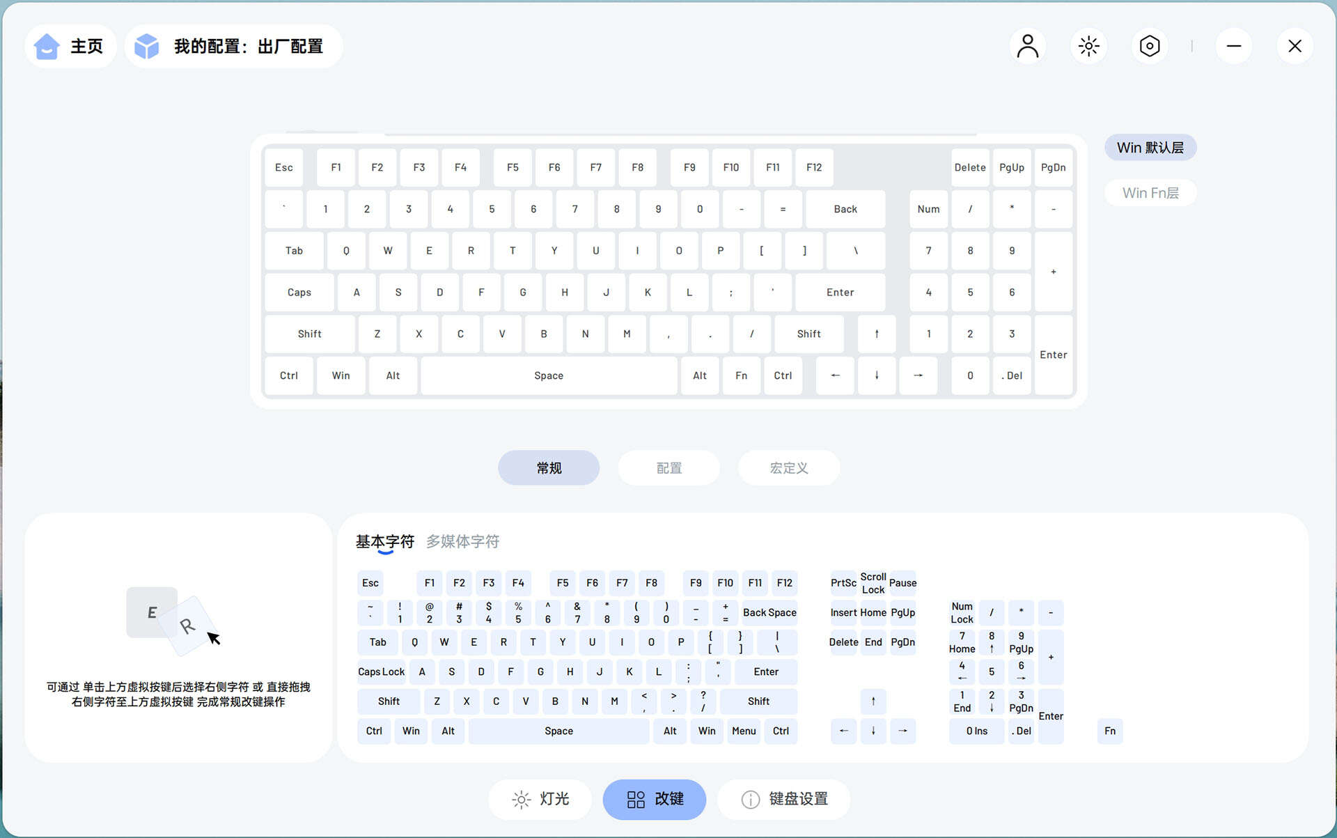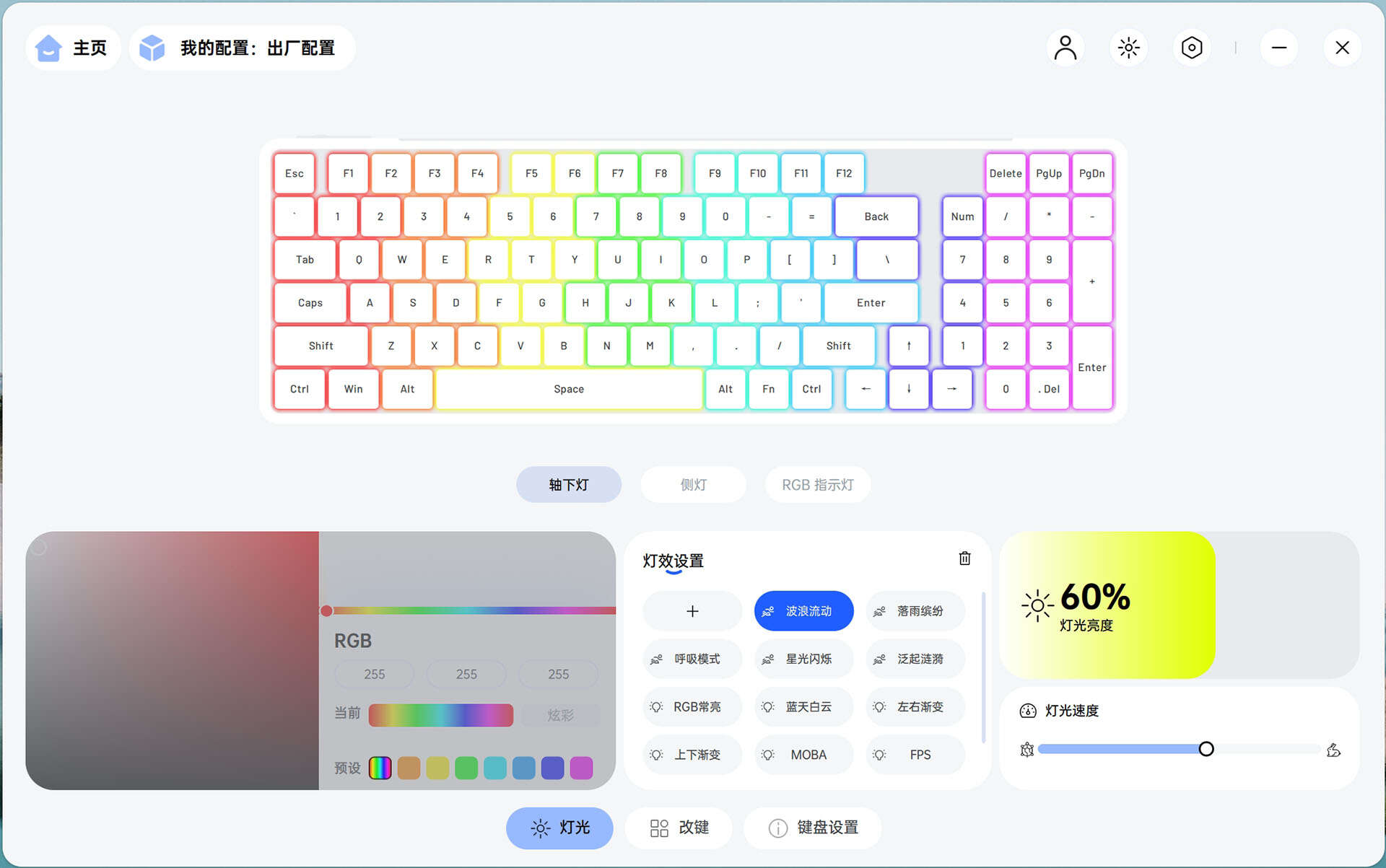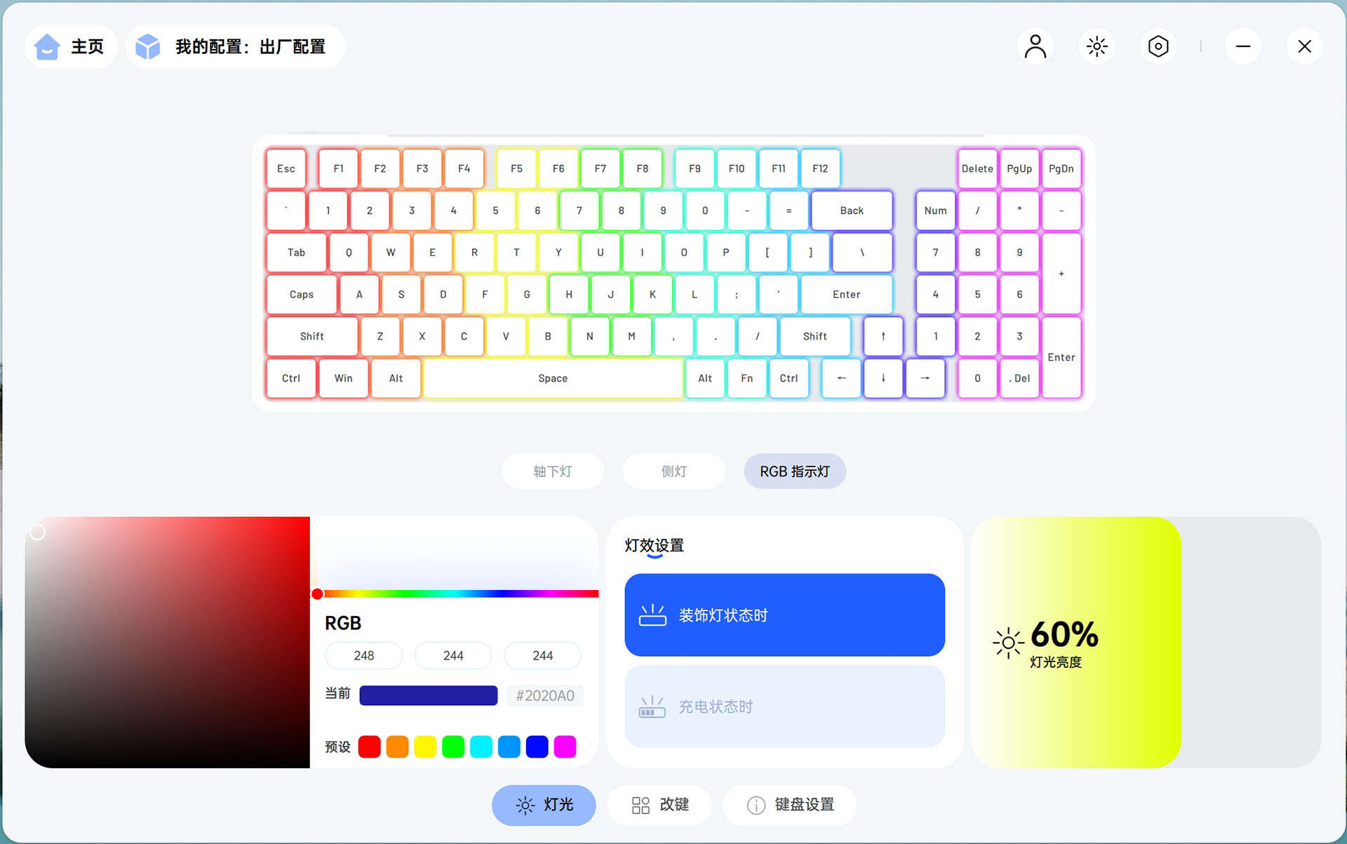 通过驱动可以对键盘的轴下灯、侧灯、RGB指示灯的色彩、亮度等进行个性化调节。而且还支持改键等功能,让键盘随着用户习惯走,修改完的键盘,就是最适合自己的键盘。