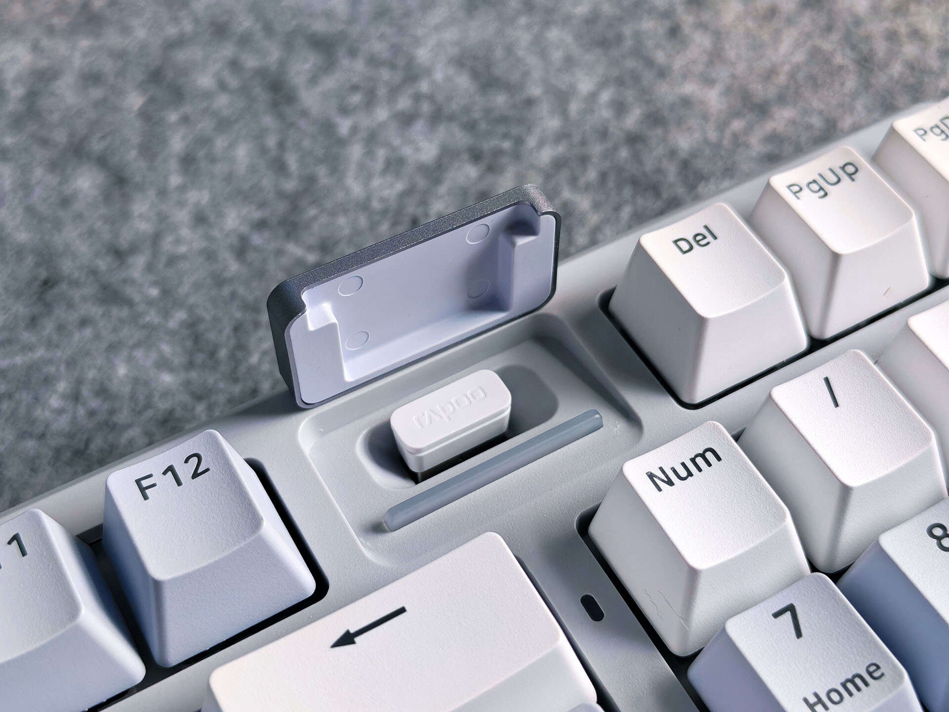 传统键盘指示灯位置是雷柏V700DIY-98键盘的黑科技所在,磁吸式"时空幻境仓"设计非常有趣,既能够起到装饰作用,同时还能够收纳2.4G接收器,此外还配有装饰灯,通过Fn+空格可查看键盘的剩余电量,充电指示灯等等,通过配套的驱动还可设置装饰灯的颜色、速度,这个设计在机械键盘领域都是独一份的存在,非常亮眼。