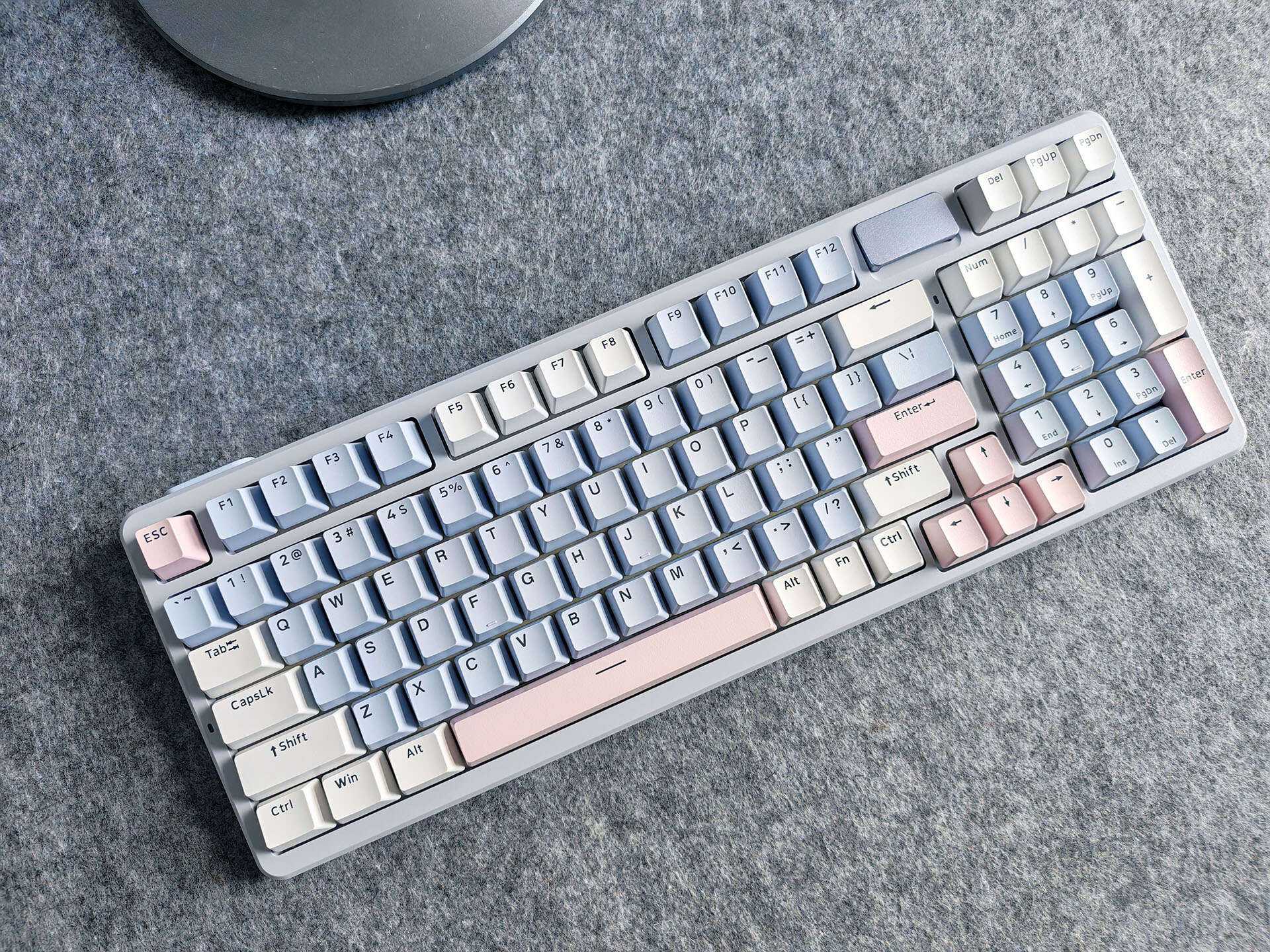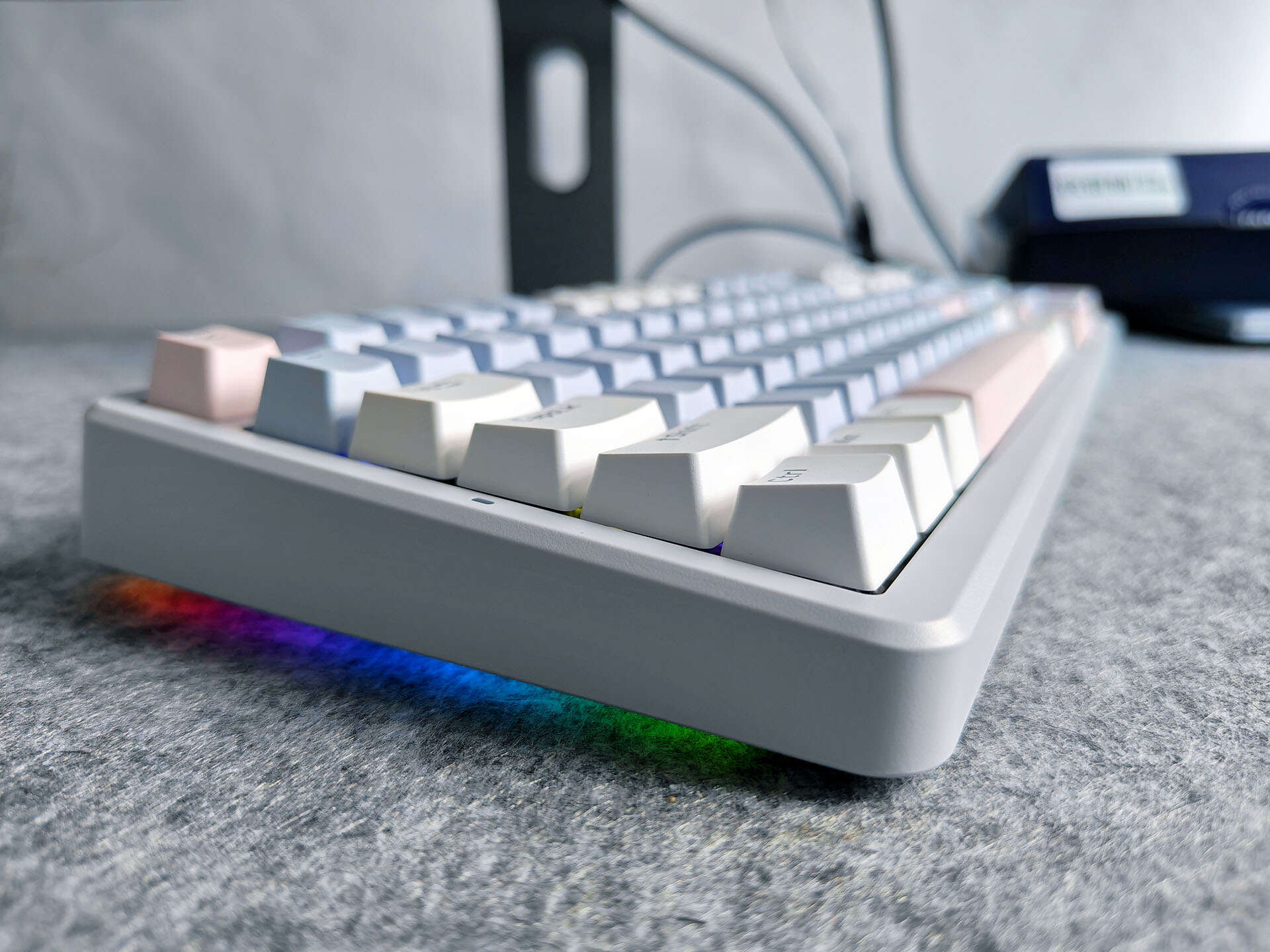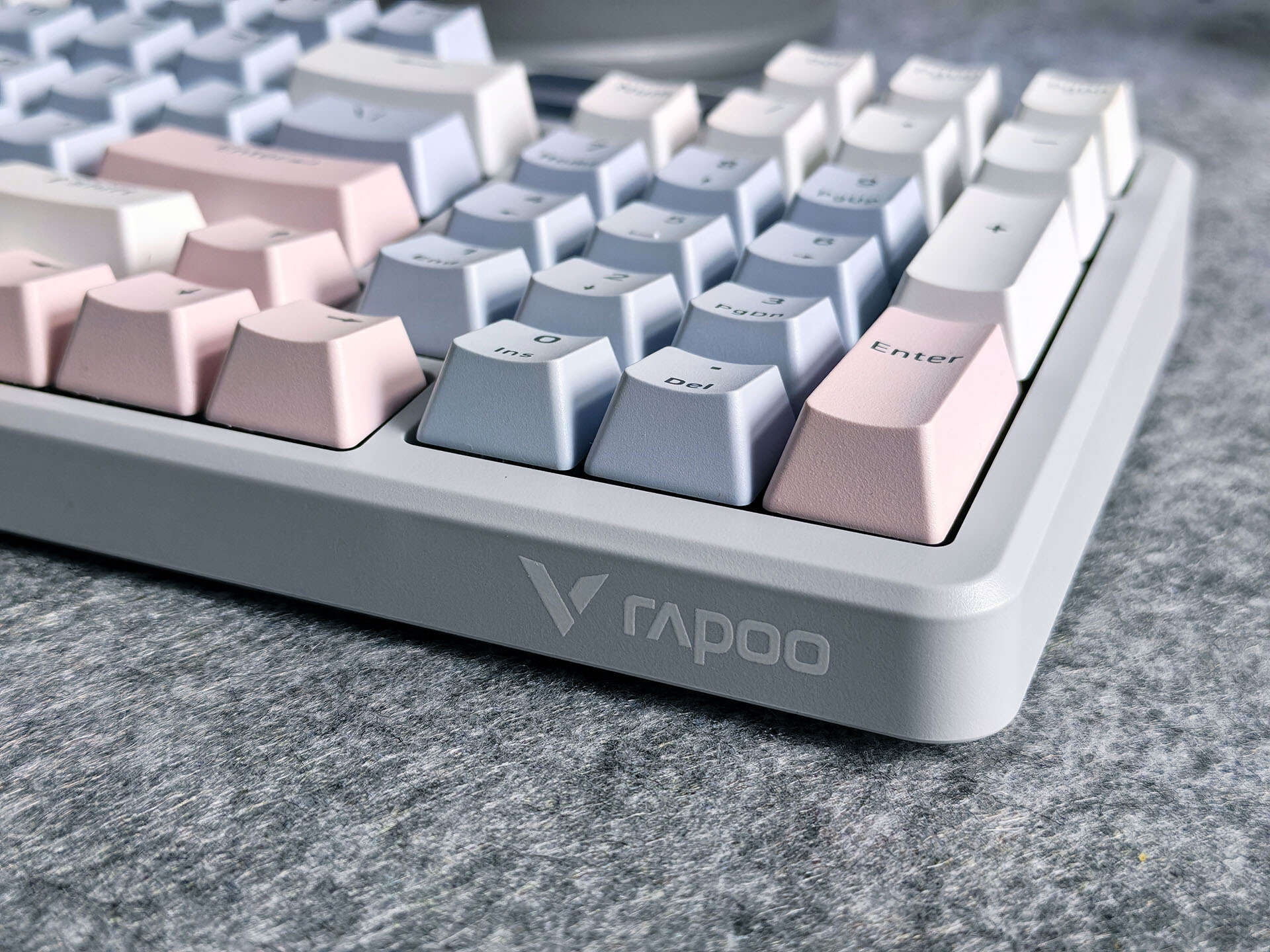 雷柏V700 DIY-98客制化多模机械键盘一共有三种颜色,我个人最喜欢的就是莫奈仙踪的配色,灰蓝粉三色的搭配,让键盘给人一种温馨感,非常符合我在家中的日常使用。