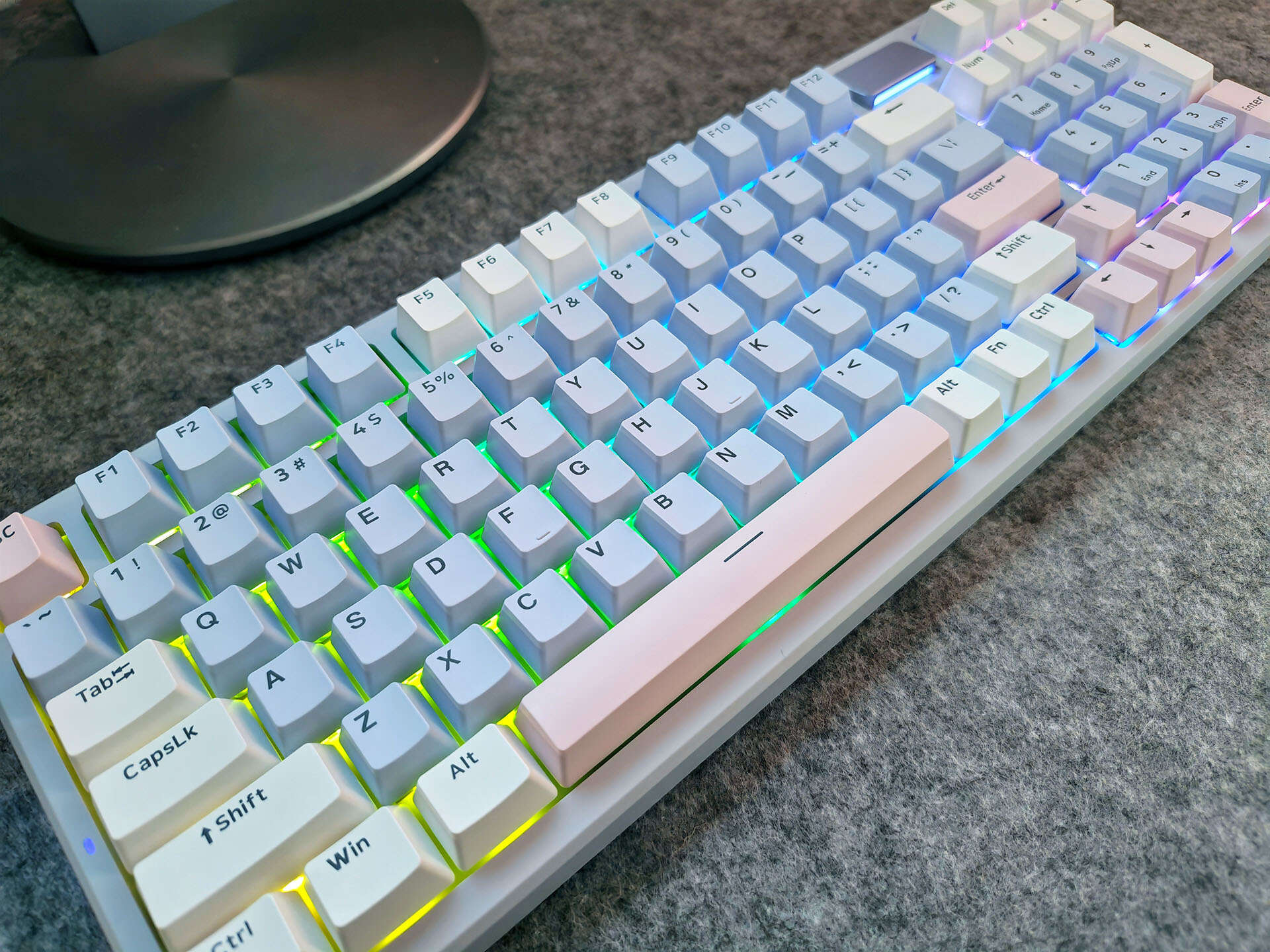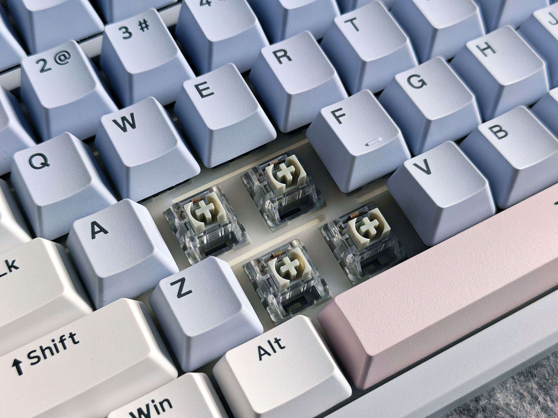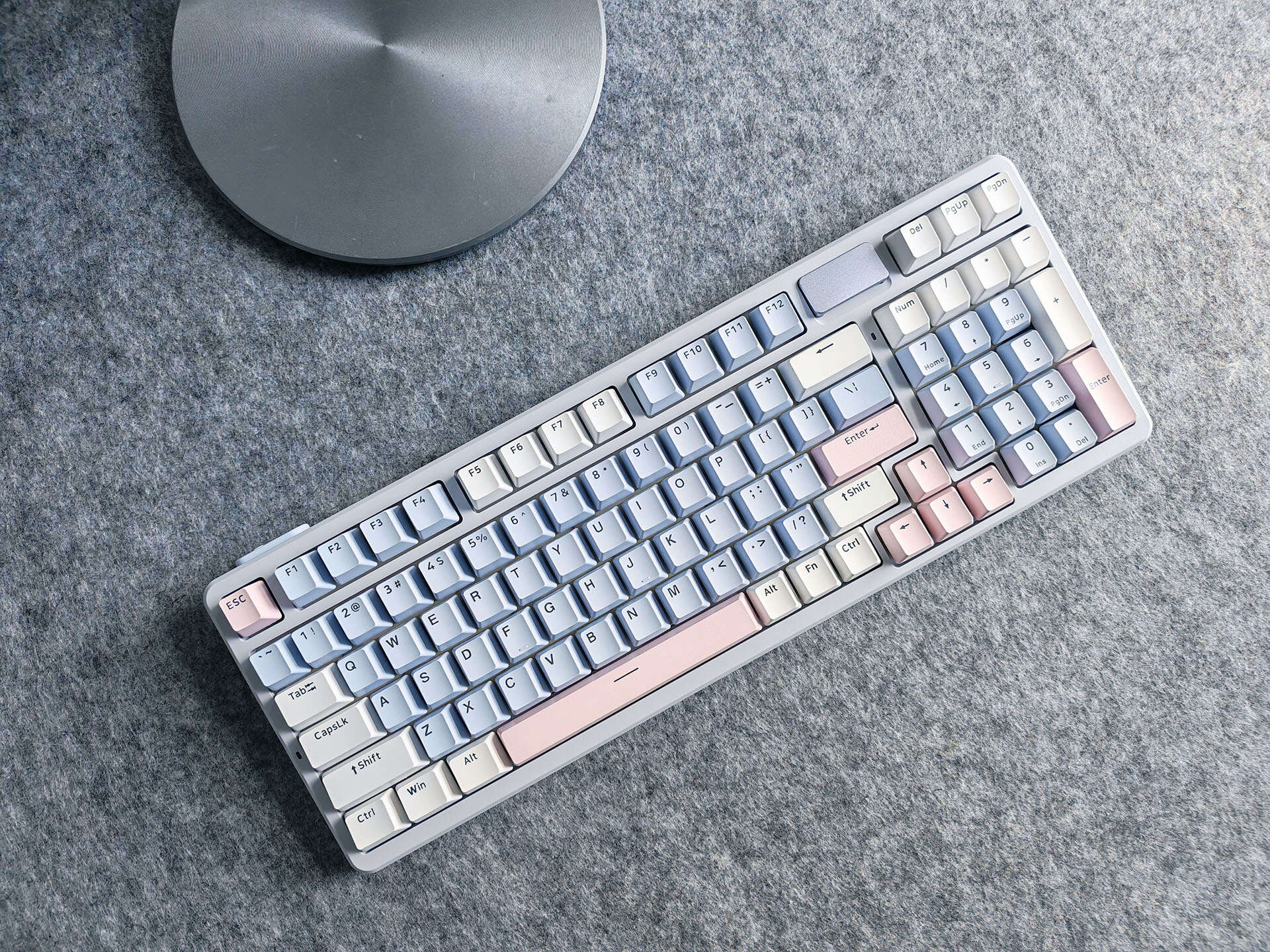 雷柏V700 DIY-98客制化多模机械键盘一共有三种颜色,我个人最喜欢的就是莫奈仙踪的配色,灰蓝粉三色的搭配,让键盘给人一种温馨感,非常符合我在家中的日常使用。