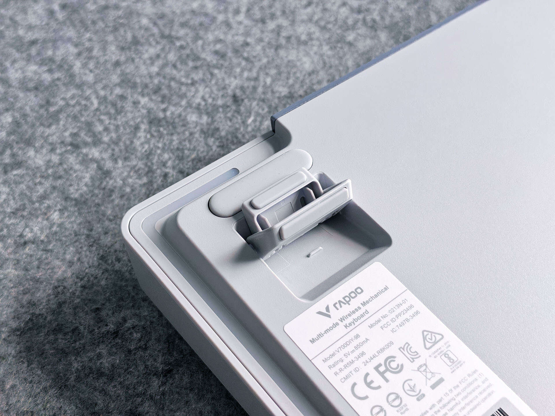 雷柏在产品设计上一直很用心,就像这把键盘的背面,它不光想到了在四个边角位置以及脚撑上配备防滑脚垫,它还给脚撑做了双段设计,这样设计之后,键盘就拥有三个不同的角度了,能够满足更多人的使用习惯。
