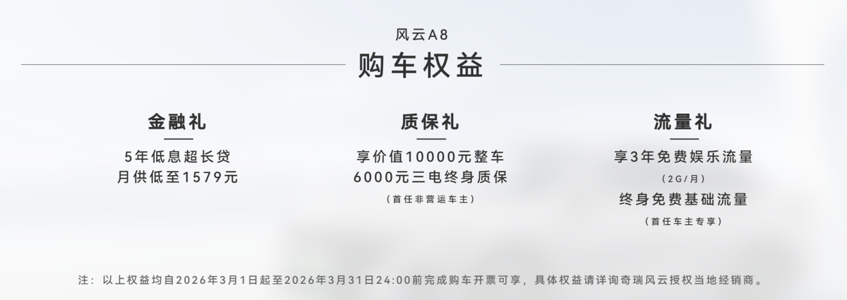现在购买风云A8,可享多重限时好礼,轻松开走这台“国民家轿”:5年低息超长贷,月供低至1579元,购车无压力;享价值10000元整车+6000元三电终身质保(首任非营运车主),用车更安心;享3年免费娱乐流量(2G/月)+终身免费基础流量(首任车主专享),畅享智能座舱。入门款车型官方指导价仅7.99万元起。