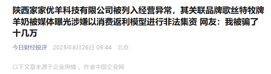 近日,企查查监控数据显示,曾卷入“歌丝特牧”羊奶消费返利集资事件的涉事企业再添高风险动态。中奶臻羊(西安)控股集团有限公司旗下子公司陕西家家优羊科技有限公司,于2026年1月9日被陕西省渭南市临渭区人民法院列入被执行人名单,执行标的31230元,案号为(2026)陕0502执126号。这一事件,连同2025年11月曝光的合同纠纷,共同成为该集资骗局持续发酵的“后遗症”。