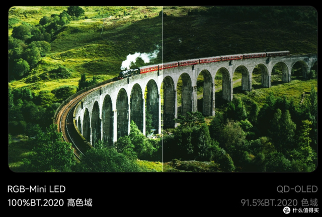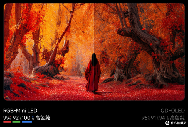 而RGB-MiniLED电视能从光源处红、绿、蓝、三原色直出,不需要量子点激发,色彩更纯,能做到高亮度下依旧发出稳定且鲜艳的颜色。画面看着更舒服,层次感更强。