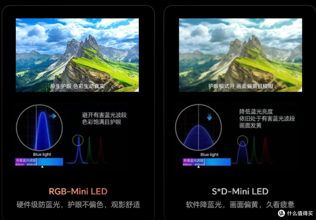 与RGB相比。在护眼方面,SQD有着先天缺陷,它不能从光源端杜绝蓝光。只能做到软件级防蓝光,即通过算法降低蓝光亮度来提高护眼程度。但这种方法有两个致命缺陷:首先,它仍然处于有害蓝光波段,只是亮度降低了,并没有从根本上消除有害光源;其次,降低蓝光会导致画面发黄,色温偏暖,看起来更难受,长时间观看反而容易视觉疲劳。这种"为了护眼牺牲画质"的做法,并不能真正做到护眼。