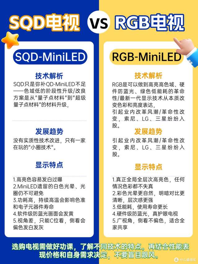 RGB和SQD应该如何选择?用技术和数据来为你解答选择电视不能只看营销话术,更要看技术路线是否先进、是否符合未来趋势。RGB-MiniLED和SQD-MiniLED虽然都属于MiniLED阵营,但技术路径截然不同,不同的技术路径直接决定了这种路径差异直接影响了显示效果、产品耐用性和观看感受。