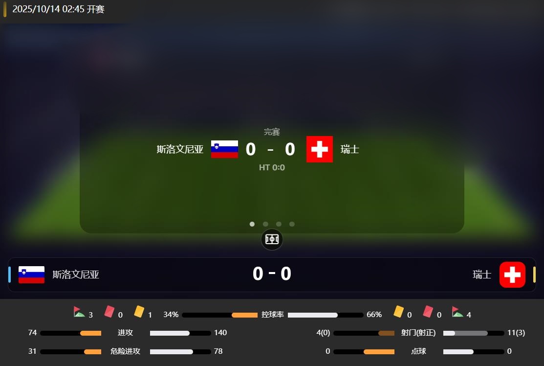 10月14日的贝尔格莱德球场,瑞士队带着66%的控球率和11脚射门(其中3次命中门框范围)前来踢馆,斯洛文尼亚则用教科书般的铁桶阵和门将奥布拉克的八爪鱼式扑救,合力奉献了一场现代足球版的《等待戈多》——全场观众既没等到进球,也没等到VAR的戏码。