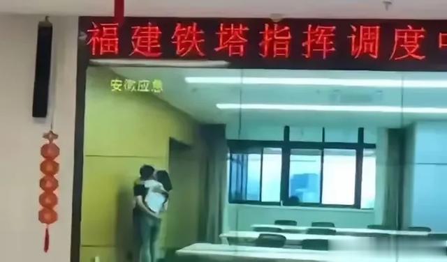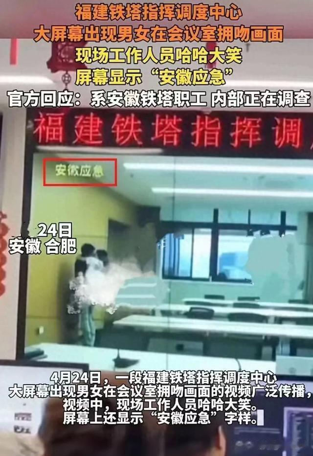 视频中,我们可以清楚的看到大屏幕上滚动显示着福建铁塔指挥调度中心,视频会议大屏幕前坐着许多人,大屏幕上显示着安徽应急四个字,而大屏幕内容竟出现一对男女紧紧拥抱在一起亲吻的画面,引得现场工作人员哈哈大笑。