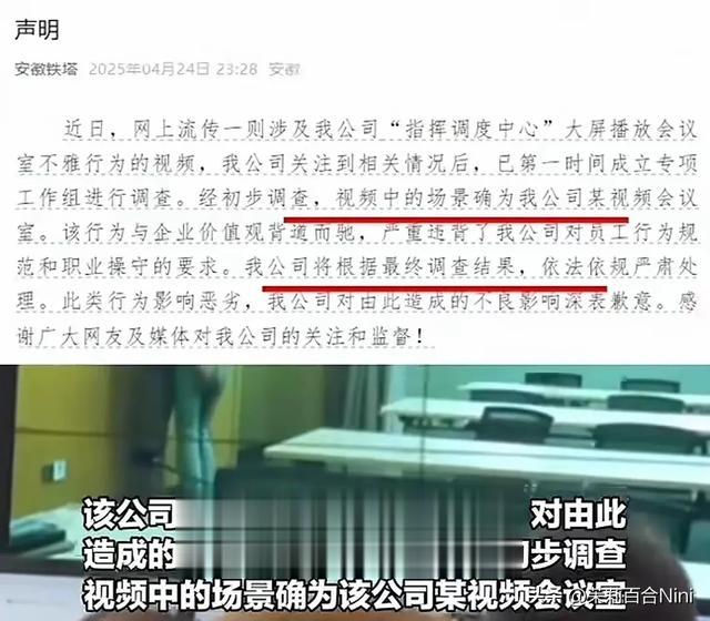 对此安徽铁塔第一时间发布了声明:表示视频中的场景确实是他们公司的某视频会议上,还表示该行为与企业价值观背道而驰,公司会根据调查结果做出严格处理。