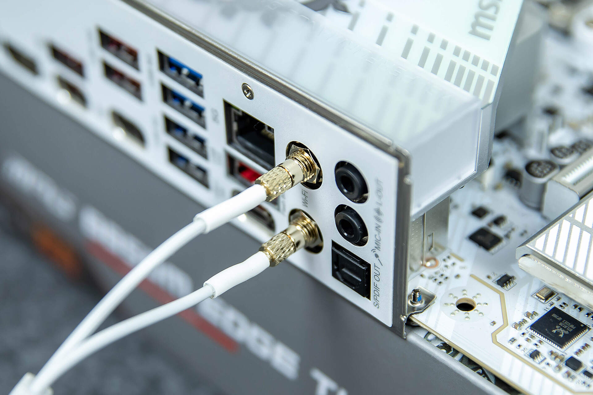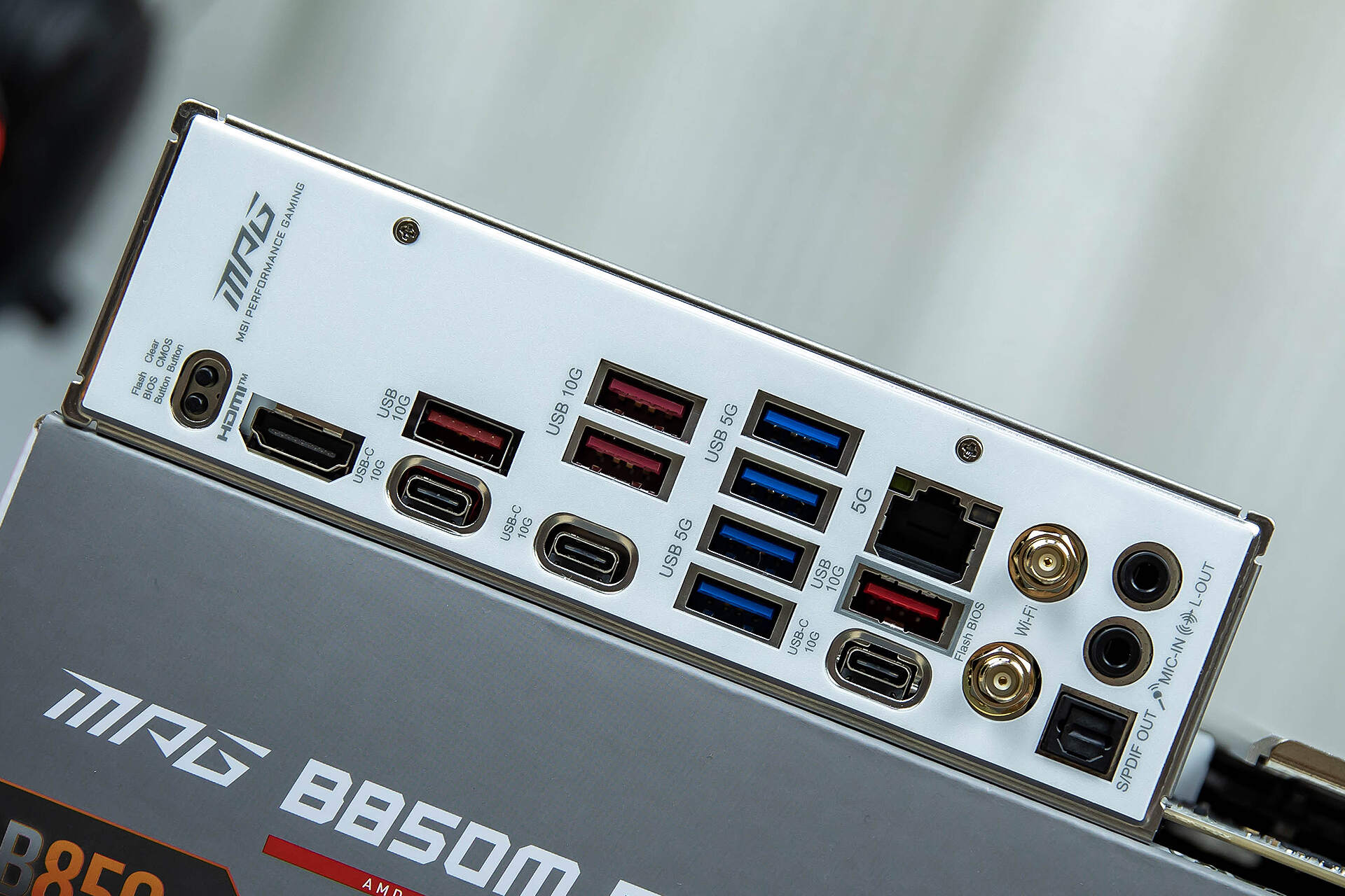 背部I/O提供了3个USB Type-C 10Gbps接口,4个USB Tpe-A 10Gbps接口以及4个USB Tpe-A 5Gbps接口,接口数量足以应对各种外设连接的需求。除此之外,还有CMOS清除键、BIOS更新键、HDMI视频接口、5G网口、Wi-Fi 7天线接口、3.5mm音频接口和1个数字光纤音频接口等。