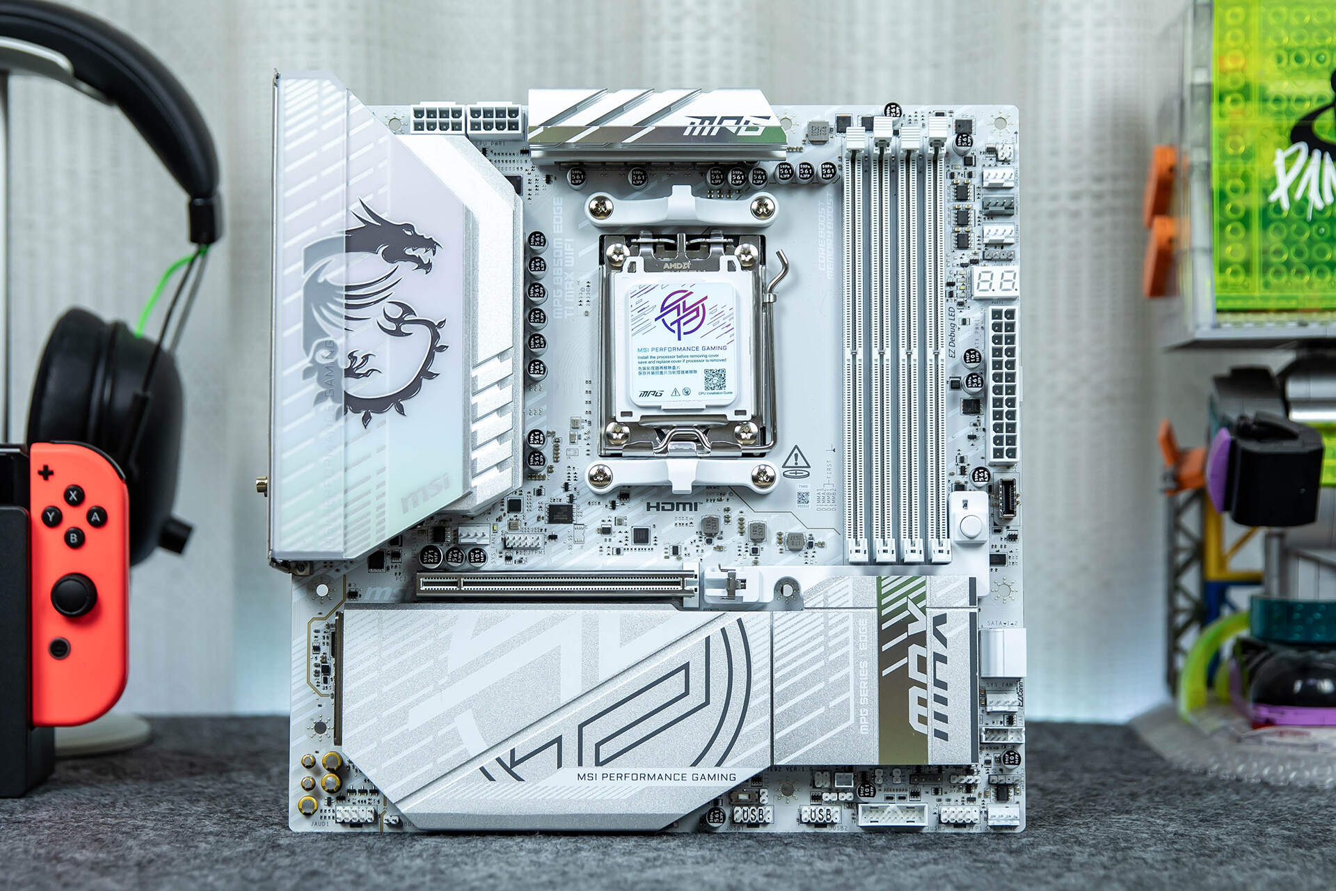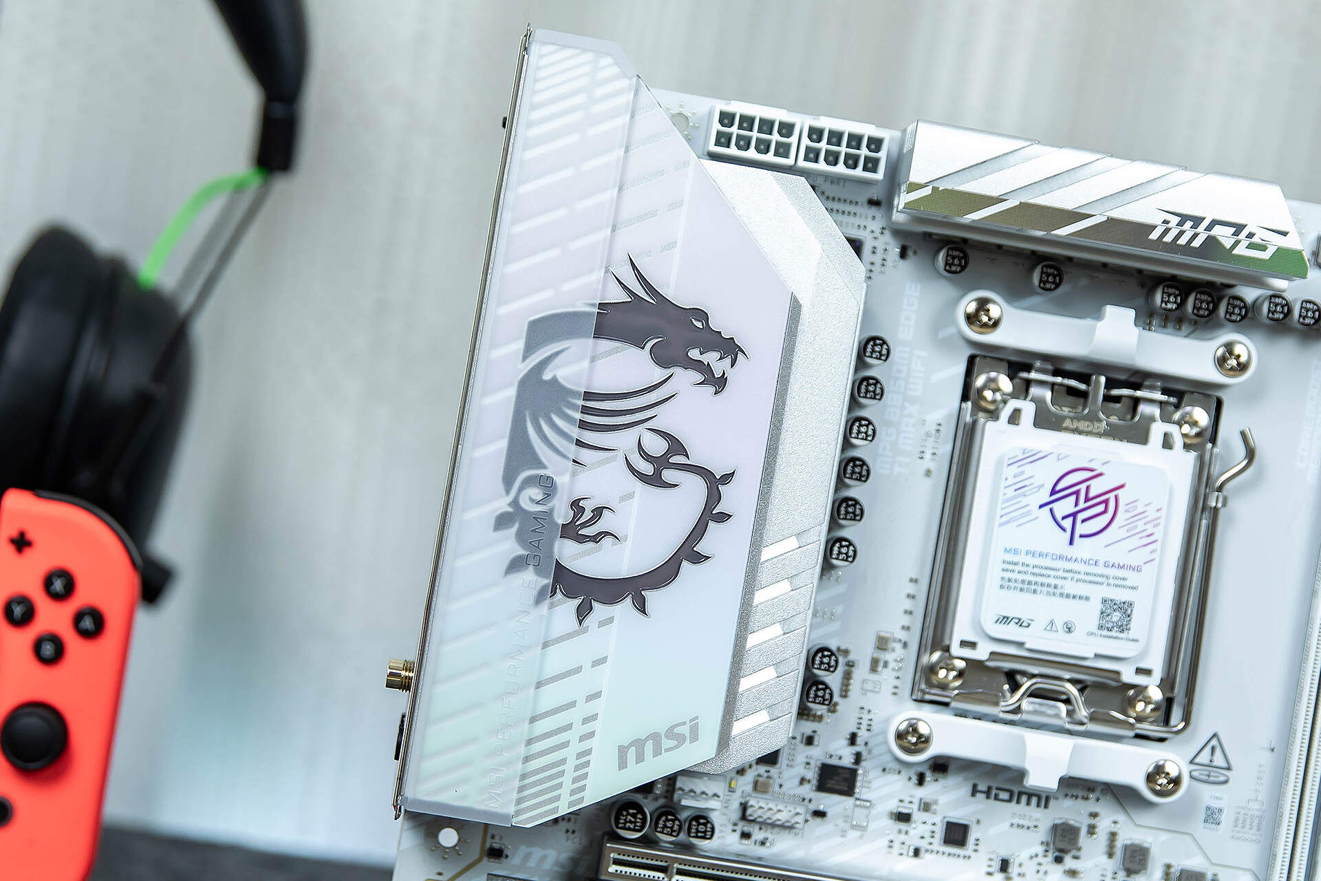 VRM散热片的“龙盾”LOGO支持RGB灯效,灯光效果可以在MSI Center软件内调控,灯光效果不会过度浮夸,比较符合追求简洁、高级感的用户审美。LOGO左侧加装了一块半透明磨砂塑料条,让我联想到了Win11主题的毛玻璃质感,另外,在核心供电和芯片组的散热装甲表面,我们可以看到两条渐变装饰带,视觉效果很赞!