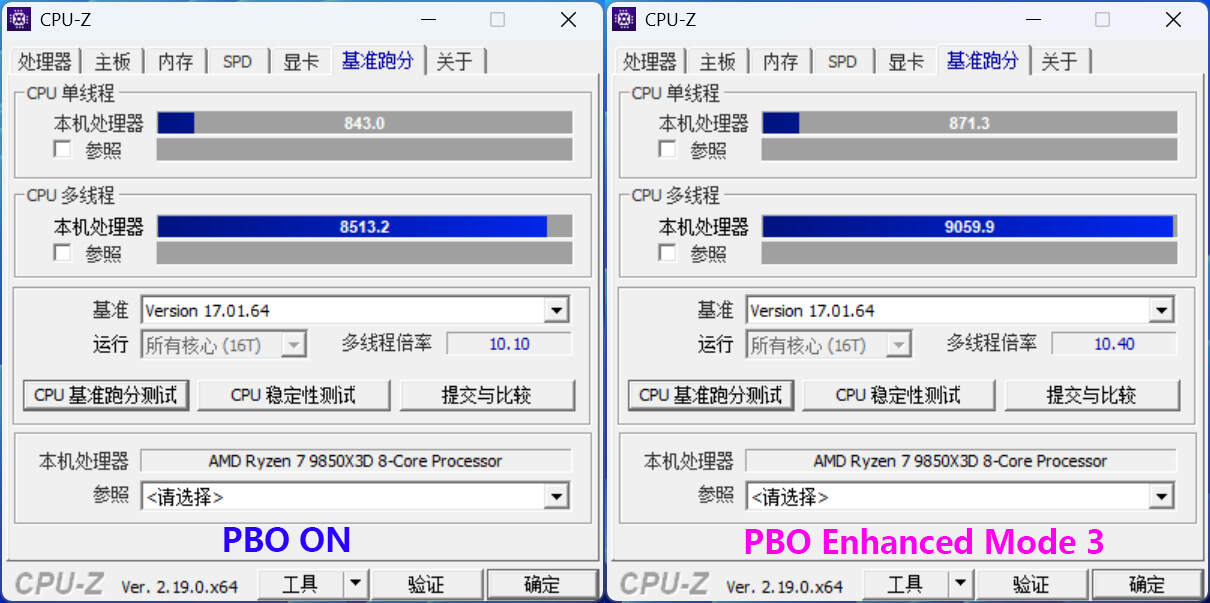 在CPU-Z的基准性能测试中,开启PBO Enhanced Mode 3后,单线程性能比PBO ON提升约3.4%,多线程性能提升约6.4%。